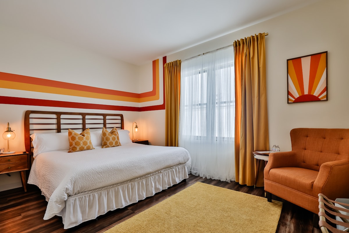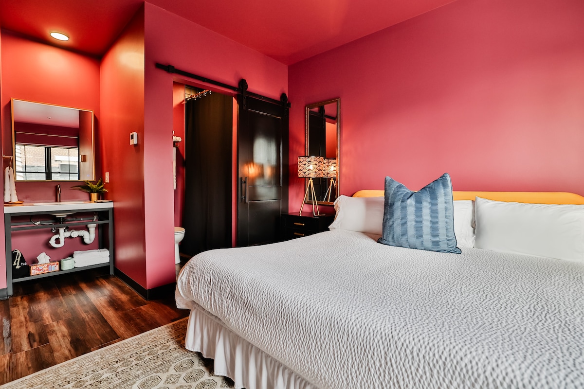 Discover refined elegance in The Riverfront Suite, where Gothic grandeur meets contemporary comfort. This distinctive retreat showcases original stained glass windows and exotic wood finishes . A plush queen bed and ambient electric fireplace create an intimate atmosphere, while the luxurious en-suite bathroom features heated floors, designer tile work, and a 2-person soaking tub. Take in panoramic city views from the shared rooftop hot tub. Perfect for couples seeking a romantic escape.