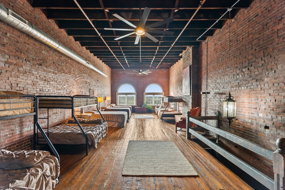 The Downtown Penthouse Loft is ideal for a large group stay! This sprawling 2,000 Sq ft open studio-style layout sleeps 18+ Guests while featuring 4 Queen bunks, 3 Reg Queens, & 4 Twins. There's a full kitchen with dining area and a full bath. The Loft is located, Top (3rd) floor, loft providing incredible sunset/sunrise & city views! Guests also have shared access to an expansive & eclectic Game Room with another full kitchen, dining area, bathroom, TVs, pool table, ping-pong, and darts.