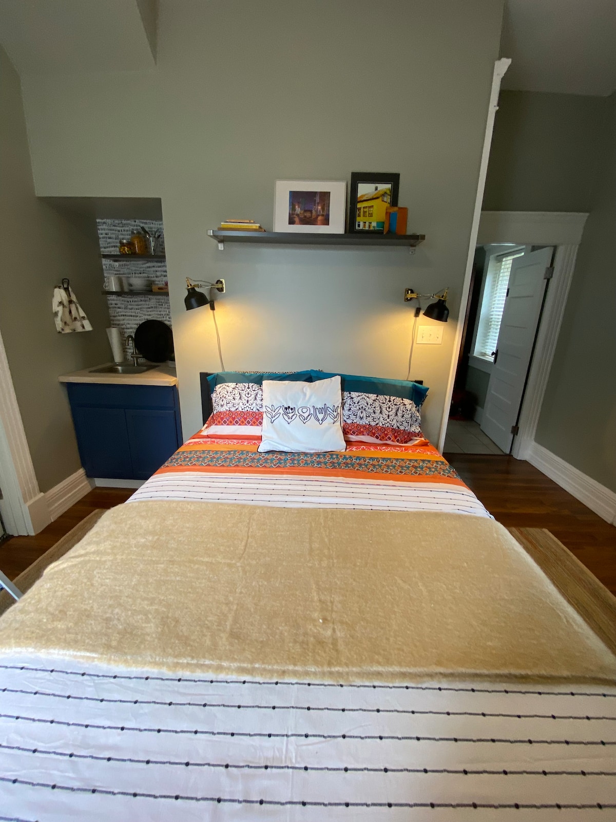 Stay in our modern lower-level studio apartment featuring an artful ambiance, queen size bed, and full kitchen. Our open layout makes this space great for a short getaway, a space to lounge and work on your creative projects, or just to explore the vibrant city. We are located in a quiet corner of The Grove, a walkable neighborhood featuring some of the best restaurants & nightlife the area has to offer. Adjacent to Cortex, Barnes Jewish Hospital, and The Missouri Botanical Gardens.