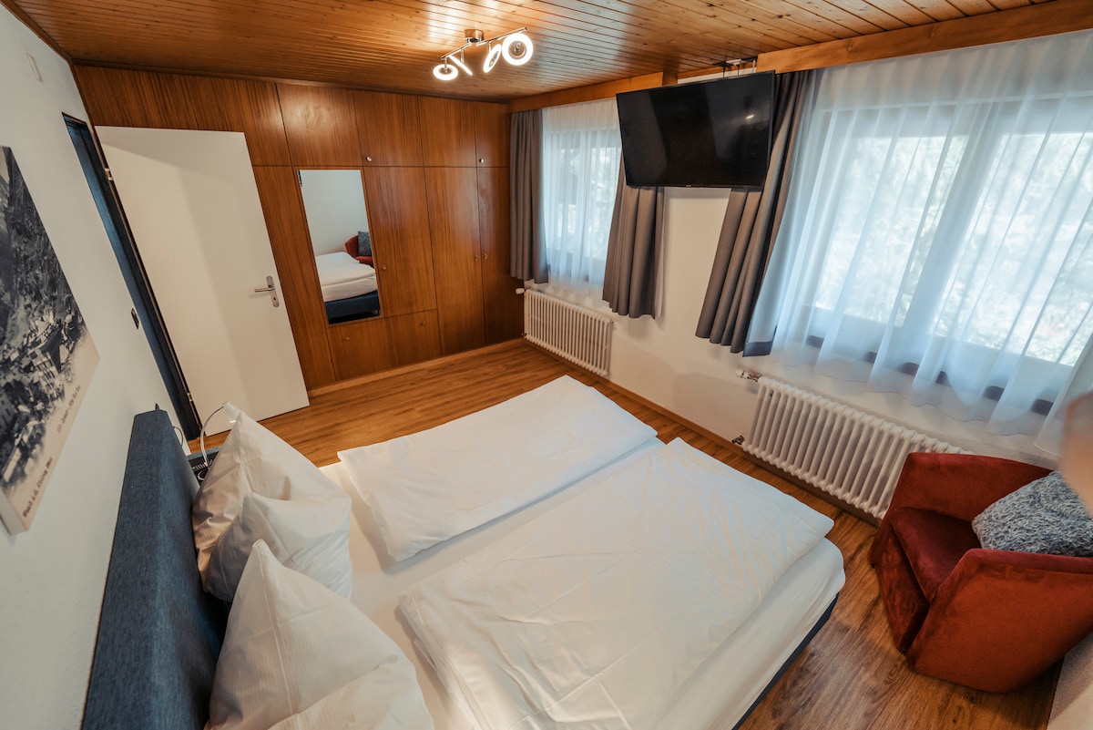 Bright 3-room apartment in a small chalet of 3 dwellings at 5 minutes walking distance from the funicular and the village centre. Drop off your car at your arrival on the included parking spot, no need anymore. You have a breathtaking view of the peaks of the Val d'Anniviers from the terrace. Ideal for 4 people, possible up to 6 (2 extra beds for children). Kitchen, windows and heating completely renovated for optimal confort.