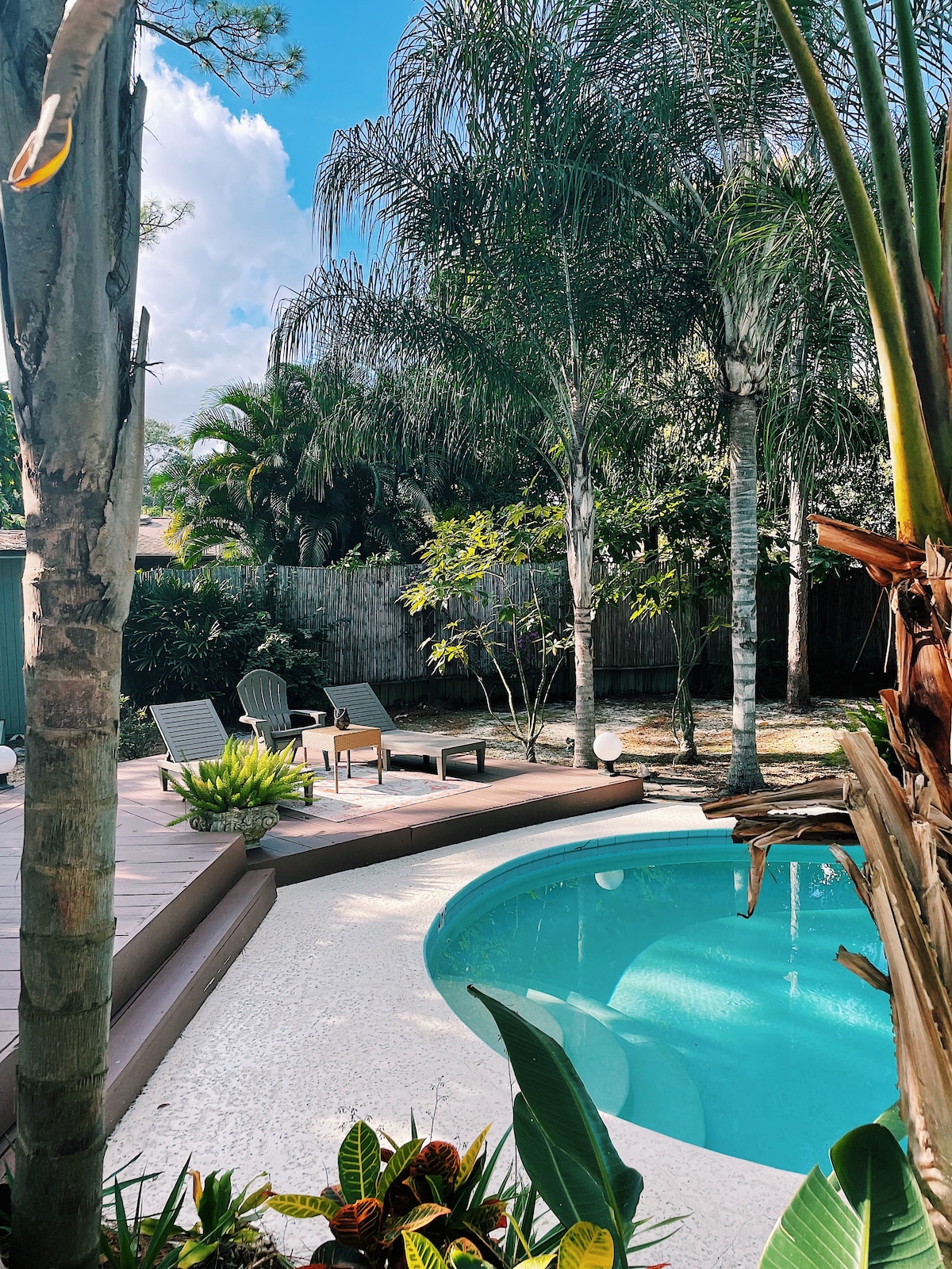 Welcome to Raintree House, a vibrant tropical oasis on Florida's Treasure coast. This 3 bedroom, 2 bathroom treehouse style cabin features an ultra private backyard with huge pool- surrounded by mature palms. Along with 70's inspired artful decor, cedar walls, and an open floor plan, this residence is made for a relaxing getaway among friends. Whether you're beach bound, exploring trendy downtown Ft Pierce, or spending your vacation poolside, Raintree House is the perfect Floridian solace.