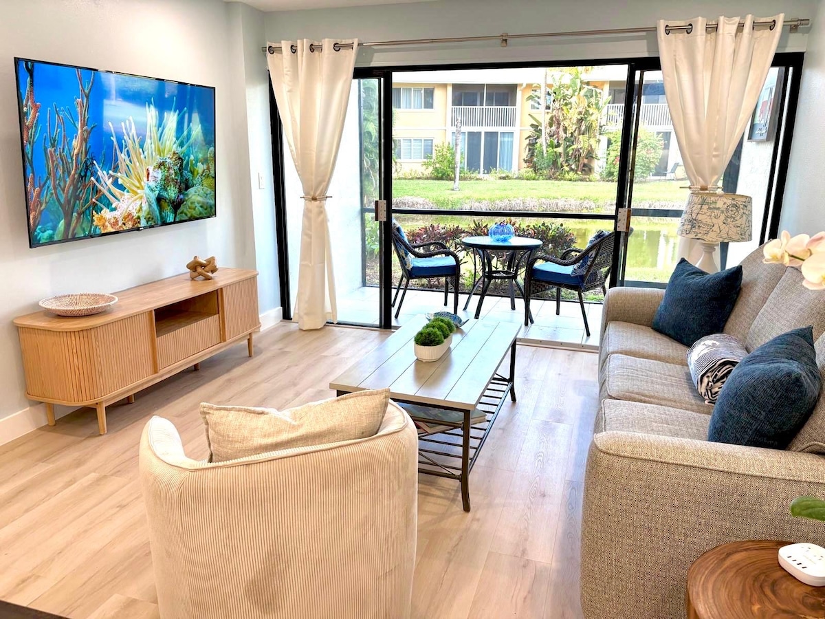 Take it easy at this pristine and refreshing getaway. Newly renovated with a peaceful view overlooking the second hole of the golf course. The condo has a master bedroom with a king bed and a queen sofa sleeper in the living room area. A short 3-min walk to the private beach makes it easy to enjoy the sands of South Hutchinson Island. Just a short walk to the Aruba pool. Ocean Village offers a multitude of amenities such as 3 pools, a 9 Hole Golf Course, Tennis Courts, Shuffleboard, and a Gym