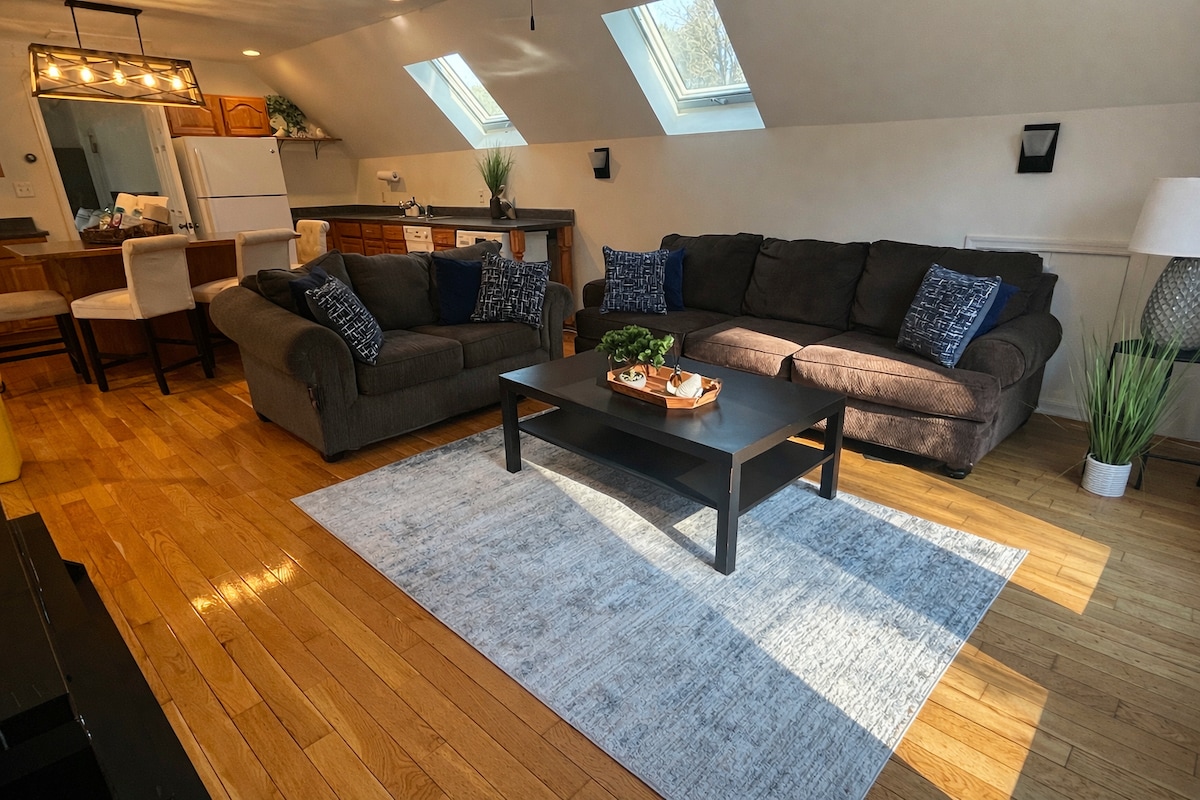 This cozy one bedroom apartment is the perfect place to unwind & relax. Located in the heart of downtown Leonardtown, the Retreat at Fenwick is steps away from many delicious dining opportunities, unique and fun shopping at local boutiques, and entertainment experiences. It includes free wifi, a full kitchen & complimentary coffee bar, a charming eat-in dining space, queen size bed, full size pull out sofa bed, a cozy electric fireplace, workspace, and twin bunkbeds that are great for kids!