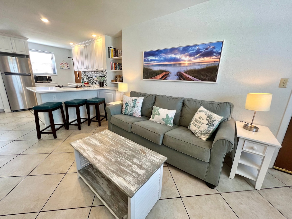 Escape to paradise in this stunning condo, situated right on the sand, you'll wake up each morning to the soothing sounds of the ocean waves and enjoy breathtaking views of the sparkling turquoise waters from your own private balcony. The condo is tastefully decorated in a modern coastal style, that will make you feel right at home. The spacious living area boasts plenty of natural light and comfortable seating for relaxing after a day at the beach.