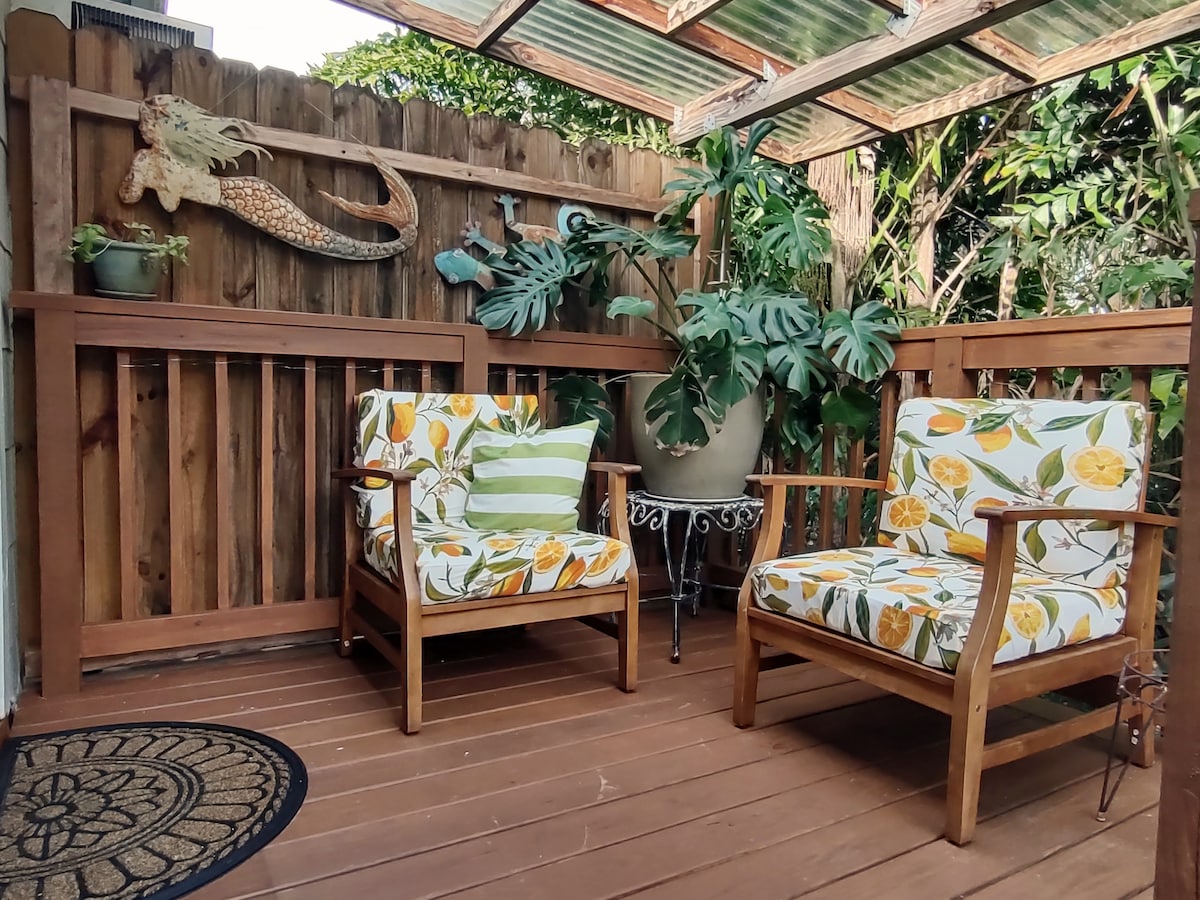 Be our guest! Welcome to our family compound where you will enjoy the treetop views from our second story carriage house guest apartment. You'll be surrounded by the tropical serenity of lush palms and plants, both inside and out, while being just around the corner from the excitement of downtown Gulfport. Our updated one bedroom apartment is fully furnished and stocked with all of the things you'll need for an extra comfortable, enjoyable stay. We look forward to hosting you!