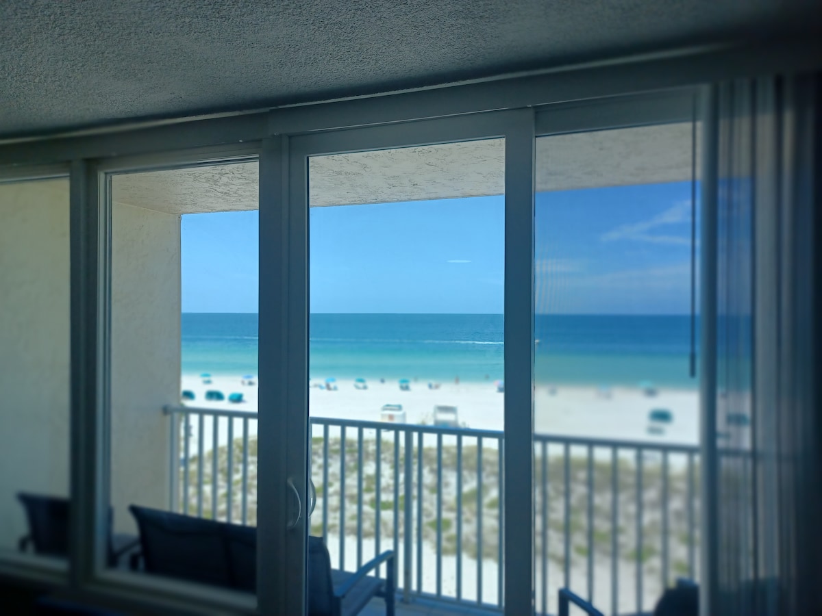 Amazing beach views from your vacation condo unit and from your private balcony. Newly refreshed privately owned condo at the Island Inn Beach Resort in Treasure Island Florida. Treasure Island is next to St. Pete Beach, south of John's Pass, Madeira Beach, Indian Rocks and Clearwater beaches. Pool bar, heated pool on beach, kitchen with two burner hot plate, pots, pans, coffee maker, microwave and more.