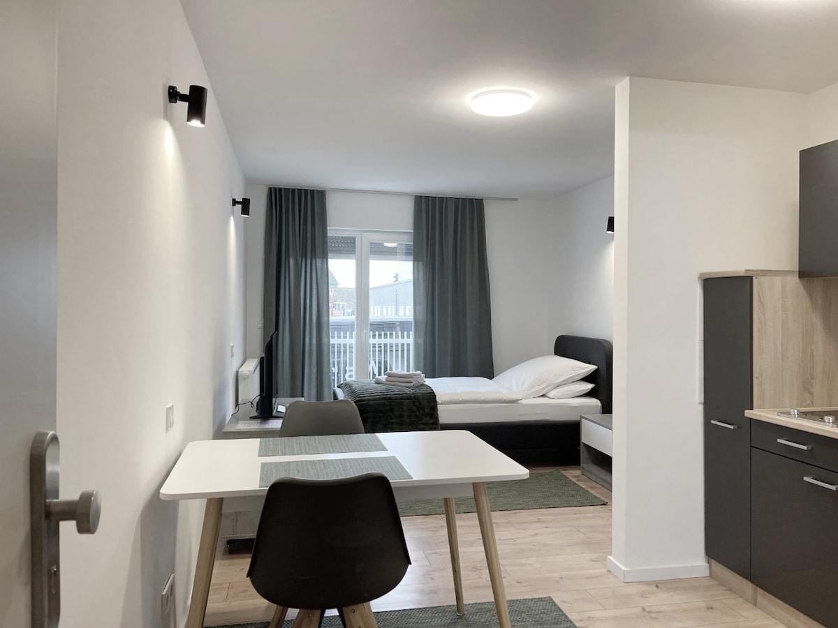 Gesamtwohnfläche 25 qm zentrale Lage Der Wohnbereich beinhaltet eine Küchenzeile mit Dunstabzug ins Freie, einen Esstisch, einen Arbeitsplatz am Fenster sowie ein Bett mit einer Breite von 1,20 m (Länge 2 m). Das Bad ist mit einer ebenerdigen Dusche ausgestattet (keine Waschmaschine integriert). Das Parkhaus am Dachauplatz ist in unmittelbarer Nähe. Weiter Stellplätze für Autos sind entlang der Straßen (kostenpflichtig). WLAN ist verfügbar.