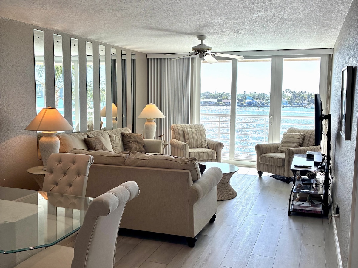 Welcome to the newly remodeled condo in the Heart of Treasure Island. This bright and modern retreat is perfect for relaxing and avoiding the crowds. Perfect location for beach lovers and wildlife watchers alike with waterfront views of the canal from the living room, kitchen and bedroom windows and beautiful sunsets. Just 2 blocks or a 5 minute walk to the beautiful white sandy beach and a few feet from the canal and heated pool. Visit nearby restaurants, John's Pass Boardwalk and live music.