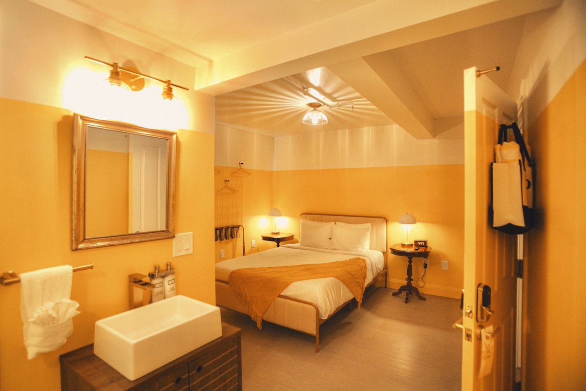 A blend of comfort and modern elegance. This boutique retreat features a king-size bed adorned with plush linens, ensuring a restful night's sleep. The room boasts a chic seating arrangement, perfect for lounging and relaxation. The well-appointed wet bar with premium amenities and a wine fridge provides convenience, inviting you to toast to special moments. The vanity area, adorned with luxury finishes, offers a space to prepare for your day or unwind in the evening.