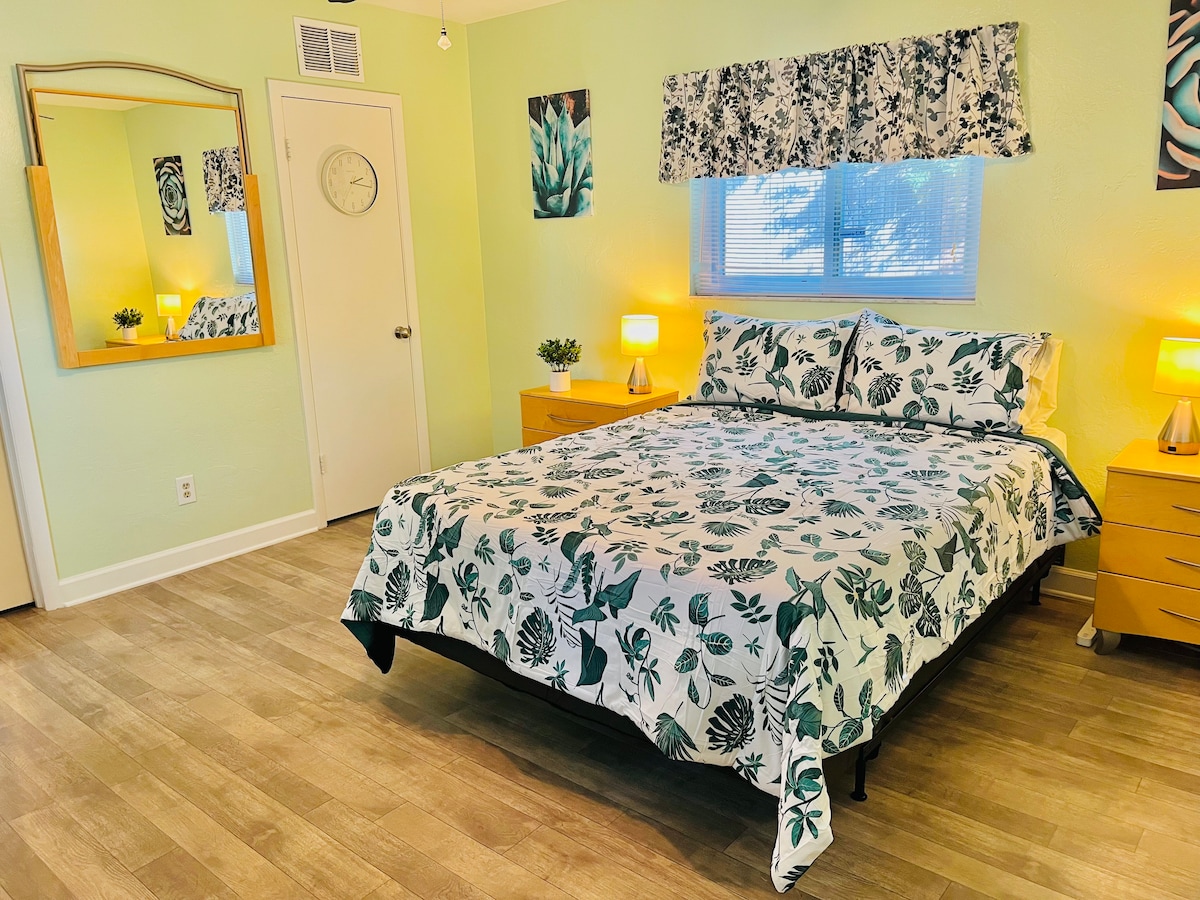 Welcome to a thoughtfully designed private studio—efficient and exceptionally clean. If your priority is a comfortable king bed, a well-maintained space, and easy access to both downtown St. Petersburg and the beaches (about a 20-minute drive), this is a reliable choice. This is one of two private studios within a tiny house setup, ideal for solo travelers or couples. Guests also have access to a shared outdoor gazebo with seating, hammocks, greenery, dining space, and a fully equipped kitchen.