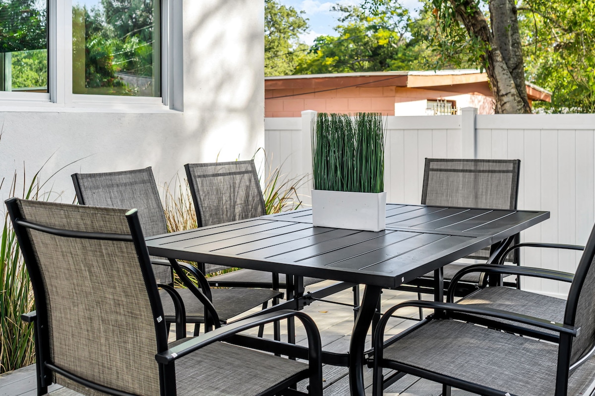 [Remodel completed June 2020] Stay in the beautiful Woodlawn Neighborhood of St. Petersburg in this gorgeous bungalow home. This fun and completely renovated two bedroom house can accommodate up to six guests comfortable and has plenty of open space to plan your excursions or relax and rejuvenate. You're only 6 minutes to downtown, 2 minutes to interstate, 11 miles to the main gulf beaches, 90 minutes to Disney World , 25 minutes to Busch Gardens, & 20 minutes to Tampa Int'l Airport.