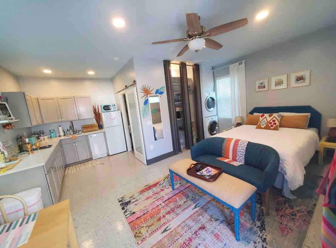 Tropical pool villa in central St Pete built in 2022, only 1 mile from Pinellas Trail, 2 miles from downtown restaurants and 5 miles from Treasure Island Beach. One room efficiency includes a comfortable queen size murphy bed, full bathroom (w/shower-no tub), large flat screen tv, with wet bar, microwave & coffee maker. Guests will have private access to pool. Smoking is NOT permitted on property and will be reported.