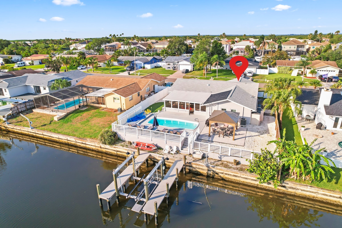 Newly remodeled pool, Feb 2025! Spa is included, pool heating $150 weekly utility fee. Please let us know if you'd like the pool heated. Get away from it all in this spacious pool home on a Tampa Bay canal. Watch the sunset as you relax by the pool in the enclosed lanai, go kayaking, and maybe see a dolphin in the canal. This beautiful 3BR/2BA home is great for the whole family. 15-30 min away from several beaches, nearby supermarkets, 35 min from Busch Gardens, 1 hr 20 min from Disney.
