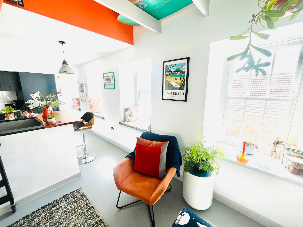 Welcome to our peaceful cottage, perfectly located at Le Hocq in St Clement. It's only two minutes walk to the beach, local pub and has a bus stop at the end of the drive taking you into St Helier or Gorey. kitchen & Bathroom down stairs. TV in kitchen. Upstairs there is a King size bed with 2 comfy chairs & 50 inch TV. Enjoy your own outdoor space with table and chairs, ideal for breakfast or a sunset drink.