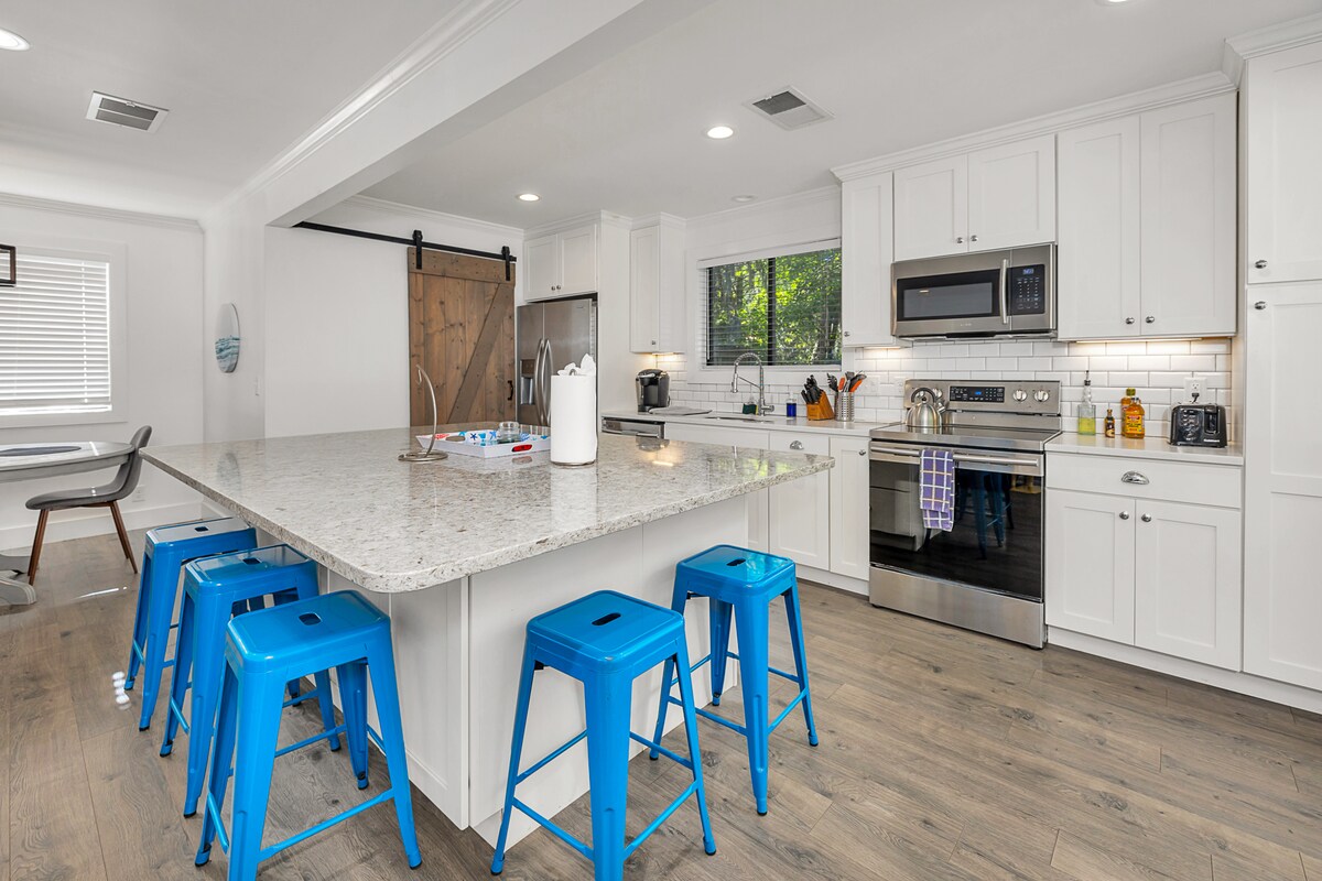 The Freddie is a newly updated 3-bedroom, 3.5-bathroom coastal cottage in the heart of St. Simons Island. It features an open floor plan with a fully equipped kitchen, dining area for six, living room with a fireplace, and a screened porch for relaxing. The master bedroom with a king bed is on the first floor, and upstairs offers a bunk room that sleeps five, a king guest bedroom, and a sitting area with a coffee station. All bedrooms have ensuite bathrooms. The home comfortably sleeps nine gues