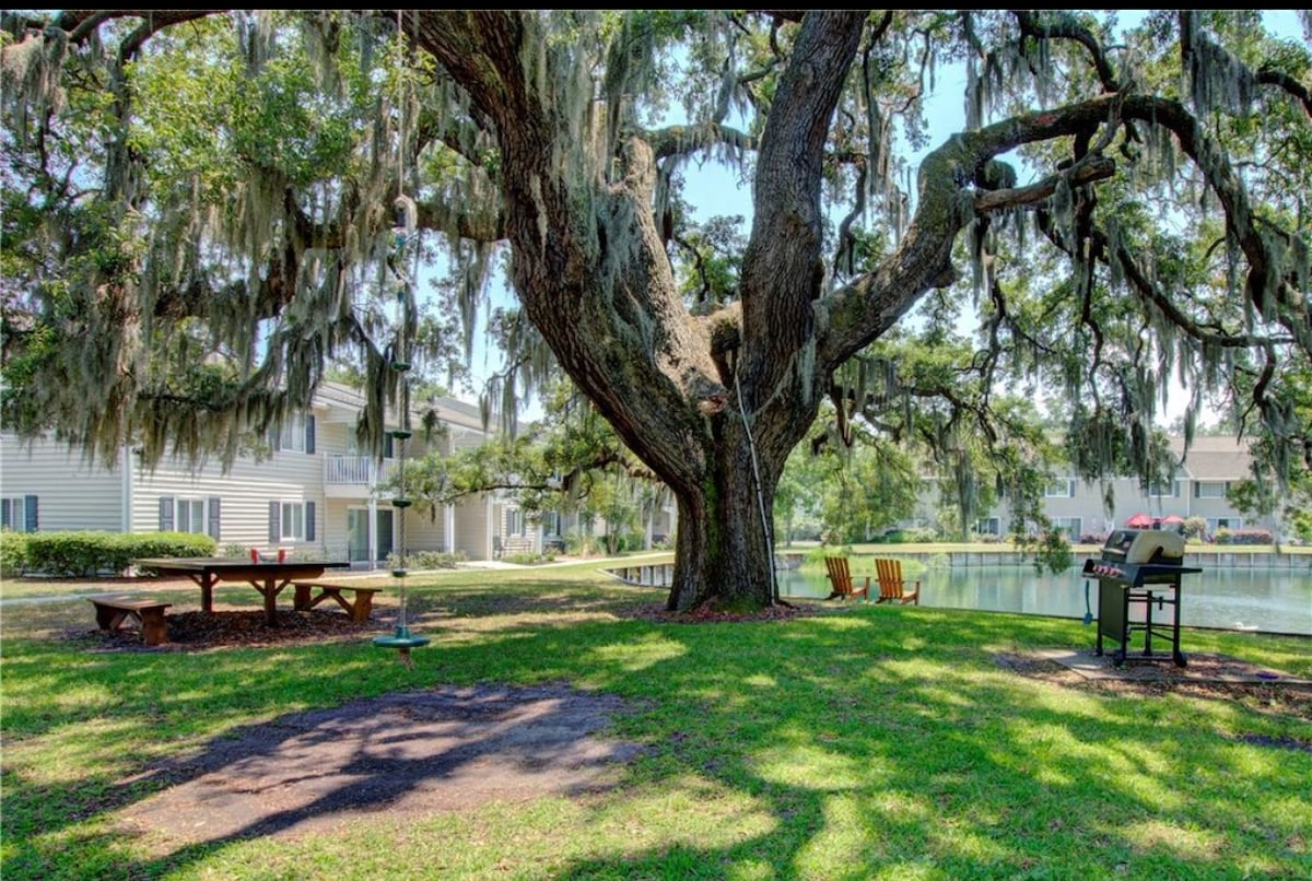 Take a break and unwind at this peaceful oasis. Whether you are coming to retreat or enjoy the Island with friends, this condo is perfect. Walk in and soak up the view of the lake and golf course, complete with a variety of birds and turtles to be observed. This spacious condo can sleep 4 guests with its king bed and very comfortable pull out couch queen bed. We have everything you'll need for cooking, cleaning and making yourself at home. The Moss Oak condo is ready! Come stay a while!
