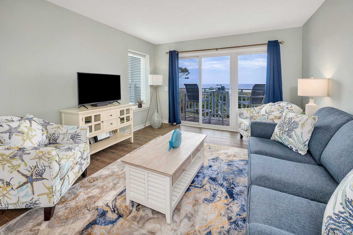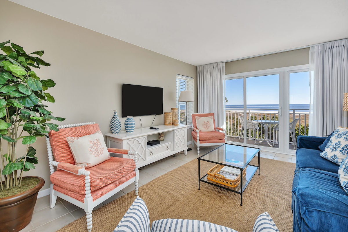 Comfort, relaxation, and beauty await you here - On the quieter and most private side of the Beach Club - with direct, gated beach access . Enjoy our oceanside pool, 2 hot tubs, and lush gardens - in the perfect spot, on one of the prettiest beaches in the South! Primary suite with king bed, walk-in shower/soaking tub. Second bedroom with 1 queen/ 1 twin, full bathroom. Well-equipped kitchen, full balcony... Come on, the dolphins are waiting for you!