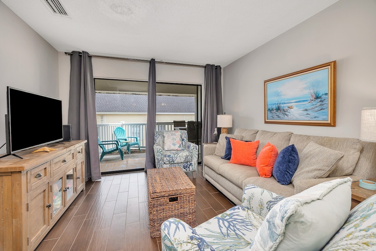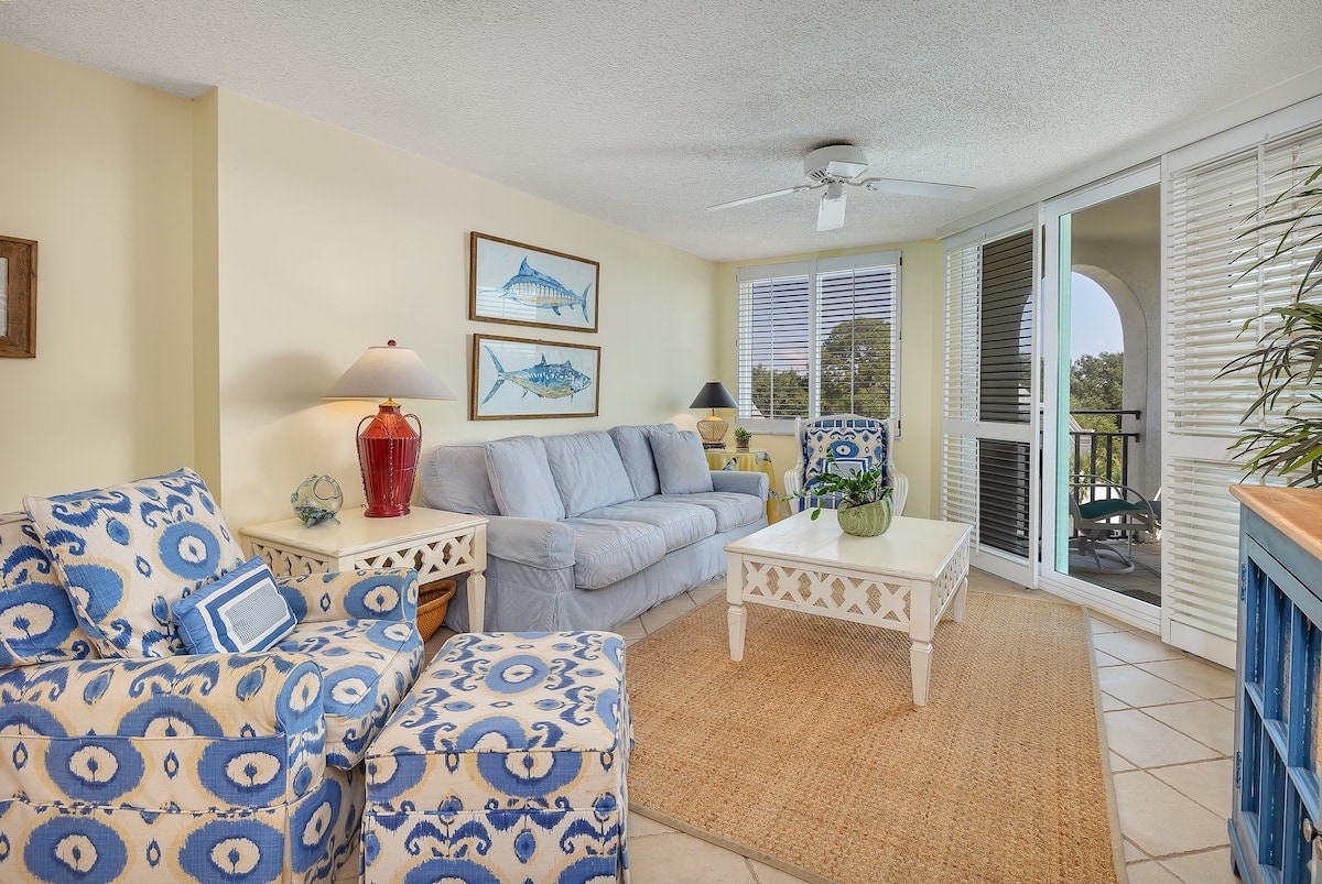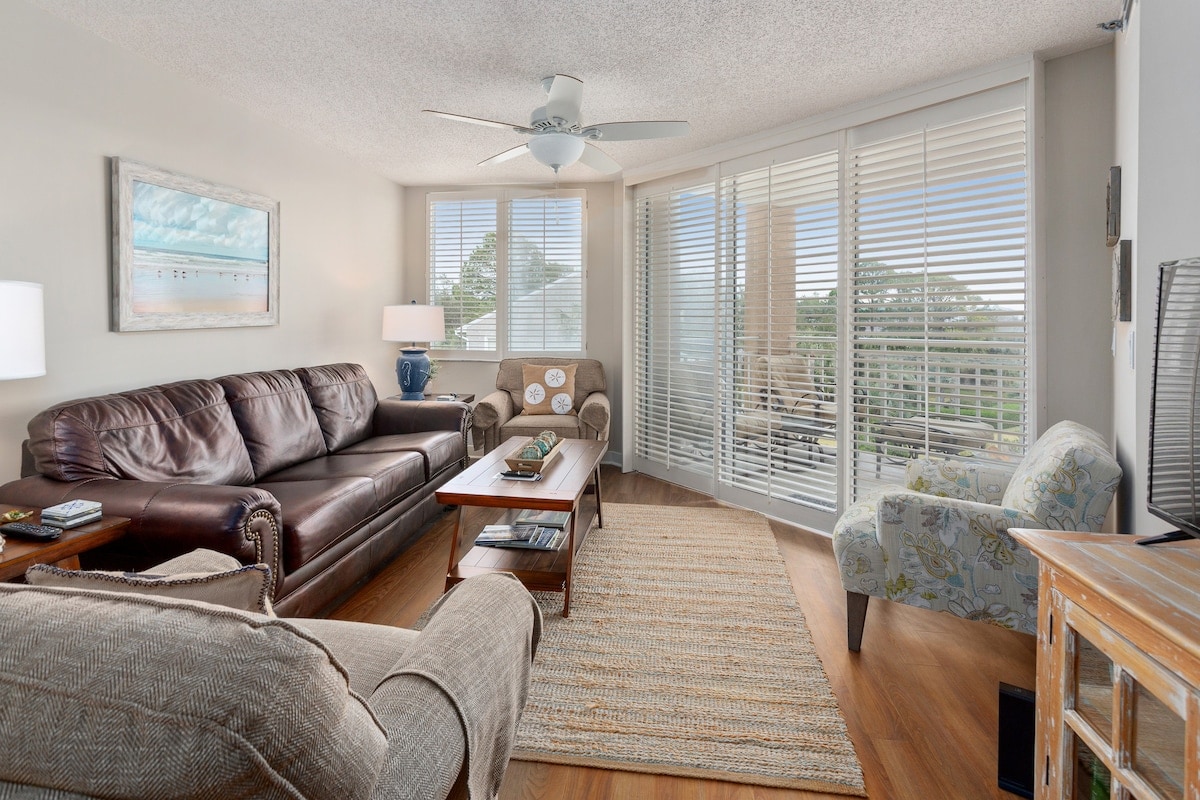 Comfort, relaxation, and beauty await you here - On the quieter and most private side of the Beach Club - with direct, gated beach access . Enjoy our oceanside saltwater pool, 2 hot tubs, and lush gardens - in the perfect spot, on one of the prettiest beaches in the South! Primary suite with king bed, walk-in shower/soaking tub. Second bedroom with 1 queen/ 1 twin, full bathroom. Well-equipped kitchen, full balcony... Come on, the dolphins are waiting for you!