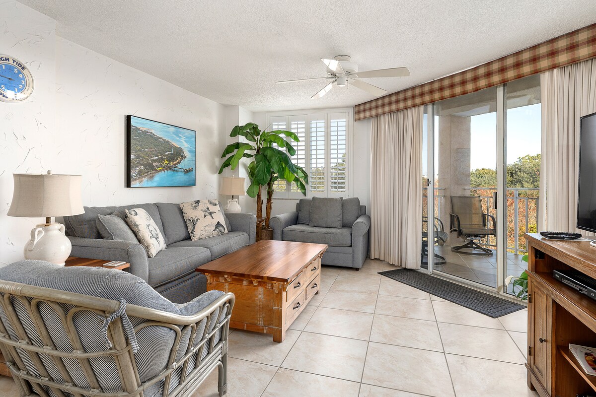 Comfort, relaxation, and beauty await you here - On the quieter and most private side of the Beach Club - with direct, gated beach access . Enjoy our oceanside pool, 2 hot tubs, and lush gardens - in the perfect spot, on one of the prettiest beaches in the South! Primary suite with king bed, walk-in shower/soaking tub. Second bedroom with 1 queen/ 1 twin, full bathroom. Well-equipped kitchen, full balcony... Come on, the dolphins are waiting for you!