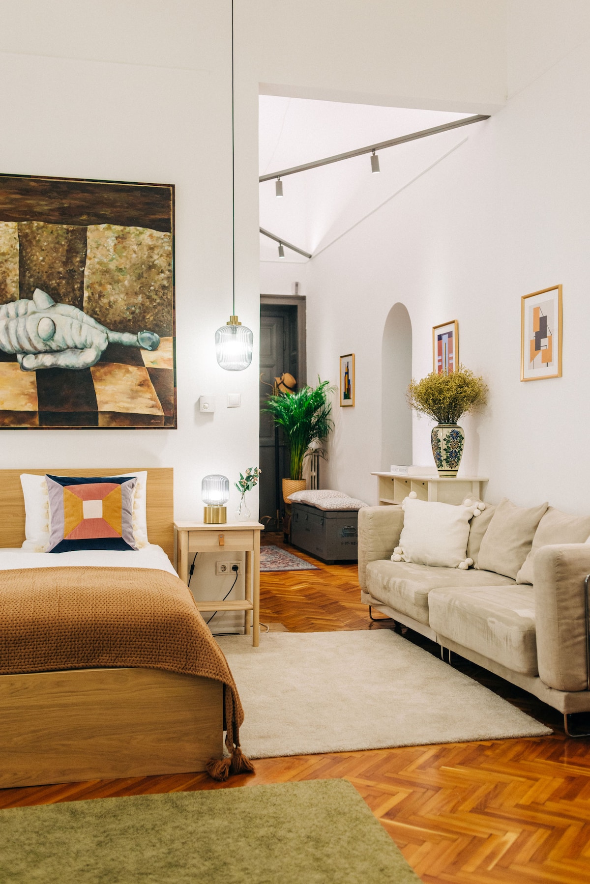 Look out over a leafy town square and the historic buildings of District V from a wall to wall window that gives the apartment its hip and airy feel. There's a calming simplicity to the interiors, with fun highlights in an array of comfy cushions. Explore the city on foot and find easy airport transport links. The Hungarian Parliament, Synagogue, and Deák Ferenc square are a short walk. There are restaurants aplenty, and the cafe in the square opposite is great for a coffee, beer, or snack.