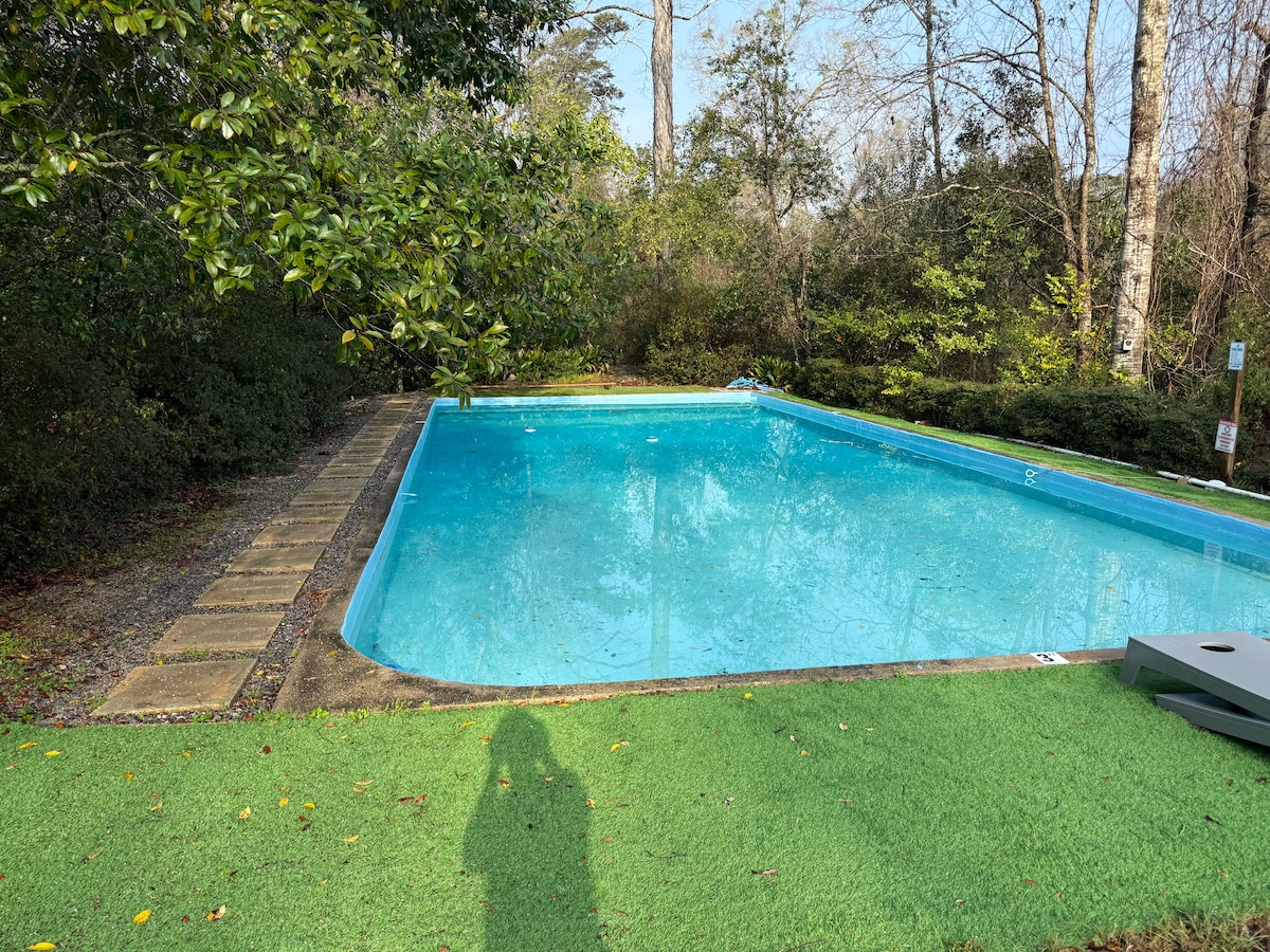 Discover tranquility at our charming farmhouse retreat on the Northshore, just 10 minutes from vibrant downtown Covington, LA. Privately set on 8 lush acres with a full-time caretaker, enjoy rustic elegance, relaxing by the pool, fishing in the stocked pond, and leisurely strolls through the walking trails around the property. Explore nearby Covington's boutiques, cozy coffee shops like Coffee Rani, and fine dining at Del Porto. Escape to peaceful bliss.