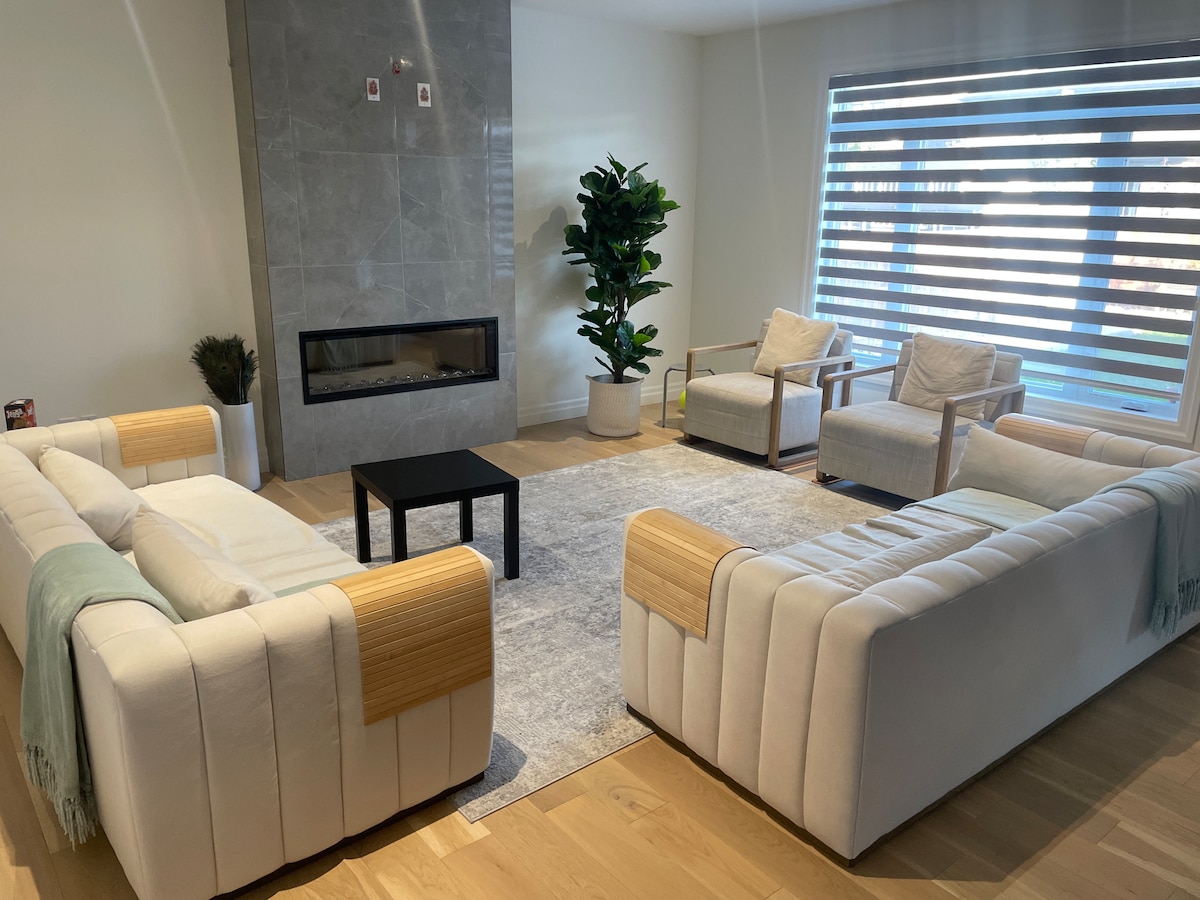 We've recently renovated our basement to create a stylish, modern, cozy and quiet guest suite. There is a side entrance that opens directly onto stairs taking you down to the unit. It has a locking metal exterior door for sound-proofing and security. The unit is a bright studio apartment with three large windows, a full kitchen, sitting area with tv and fireplace, dining table, queen-sized bed, walk-in closet and your own private bathroom with a five-foot shower. With extensive sound-proofing!