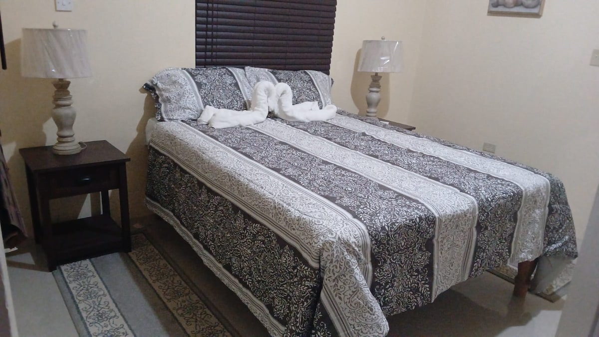 Kick back and relax in this calm, stylish space. This listing is the 1 bedroom Queen. You will have access to your own space, private balcony and kitchen. The space comes suited with WiFi, AC and hot and cold water. This gem is situated in historic Amity Hall St. Thomas. The villa overlooks the lush countryside and is close to world-famous beaches. Watch the sunrise and sunsets from your private balcony while indulging in Blue Mountain Coffee. It doesn't get any better than this! A true gem!