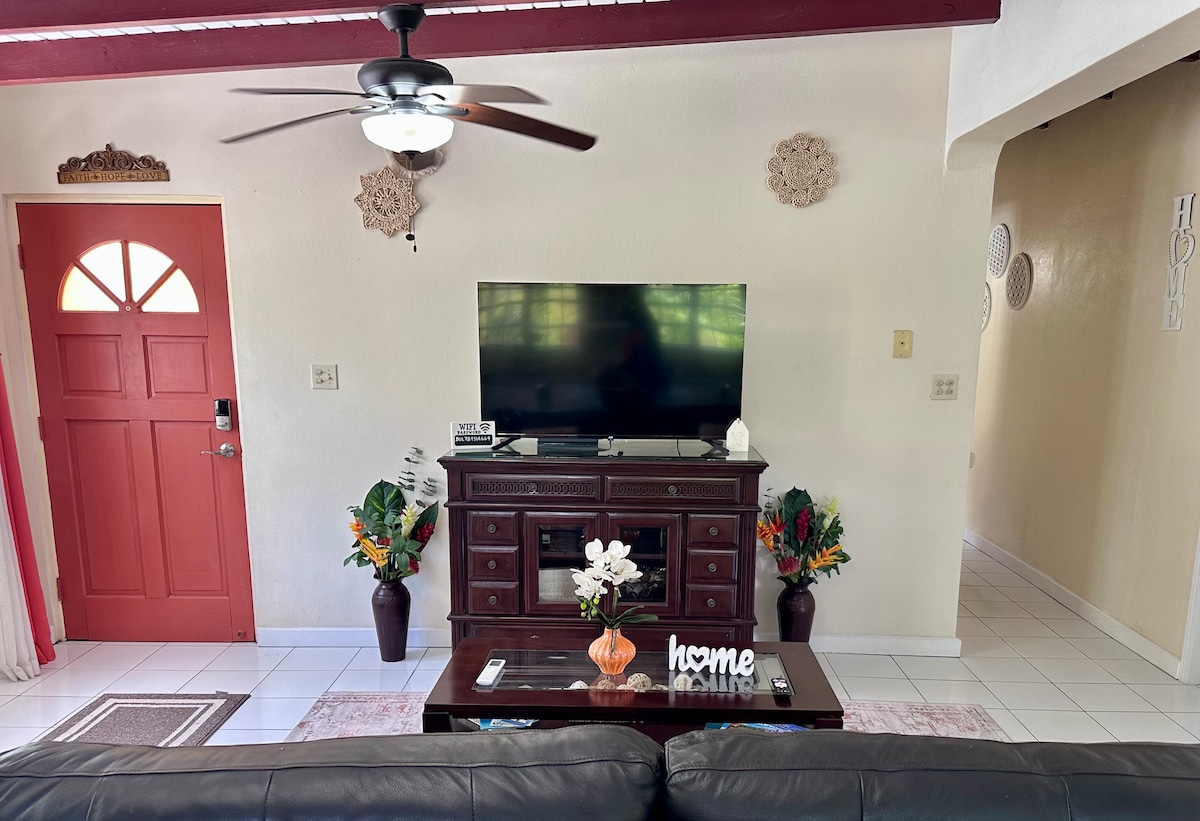 Come experience Jefe’s Poolside Oasis, nestled in the mountains with breathtaking views of the Caribbean Sea, Harbor, and Charlotte Amalie. You'll have your own guest house inside the Reel Paradise Estate, which feels like a tropical paradise. Step outside and take a dip in the pool just a few steps away, or lounge in the sun with a refreshing drink. The cozy living area has a comfortable seating area with an HD TV, a fully equipped kitchen, and a dining table for four.