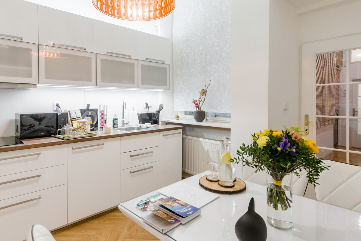 Newly refurbished & beautifully decorated apartment next to the OLD TOWN SQUARE with Renaissance staircase and many beautiful historical elements apartment offers: free high-speed WIFI, fully equipped kitchen with dishwasher, TV with international channels, sound-proof windows, quality mattresses for your comfortable sleep, air-condition and a new modern interior combined with beautifully preserved old wooden floors. Comfortably sleeps 4 guests. To all our guests coffee and teas are provided