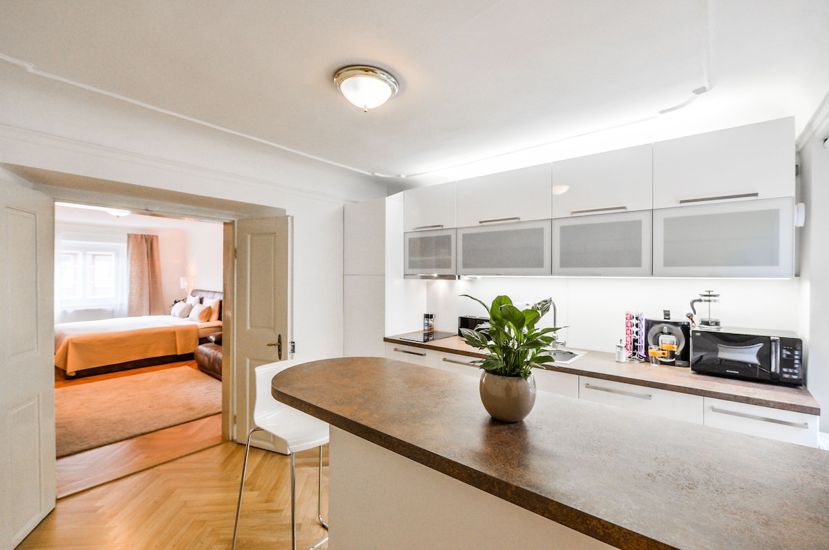 Newly refurbished & beautifully decorated apartment next to the OLD TOWN SQUARE with Renaissance staircase and many beautiful historical elements apartment offers: free high-speed WIFI, fully equipped kitchen with dishwasher, TV with international channels, sound-proof windows, quality mattresses for your comfortable sleep, air-condition and a new modern interior combined with beautifully preserved old wooden floors. Comfortably sleeps 4 guests. To all our guests coffee and teas are provided