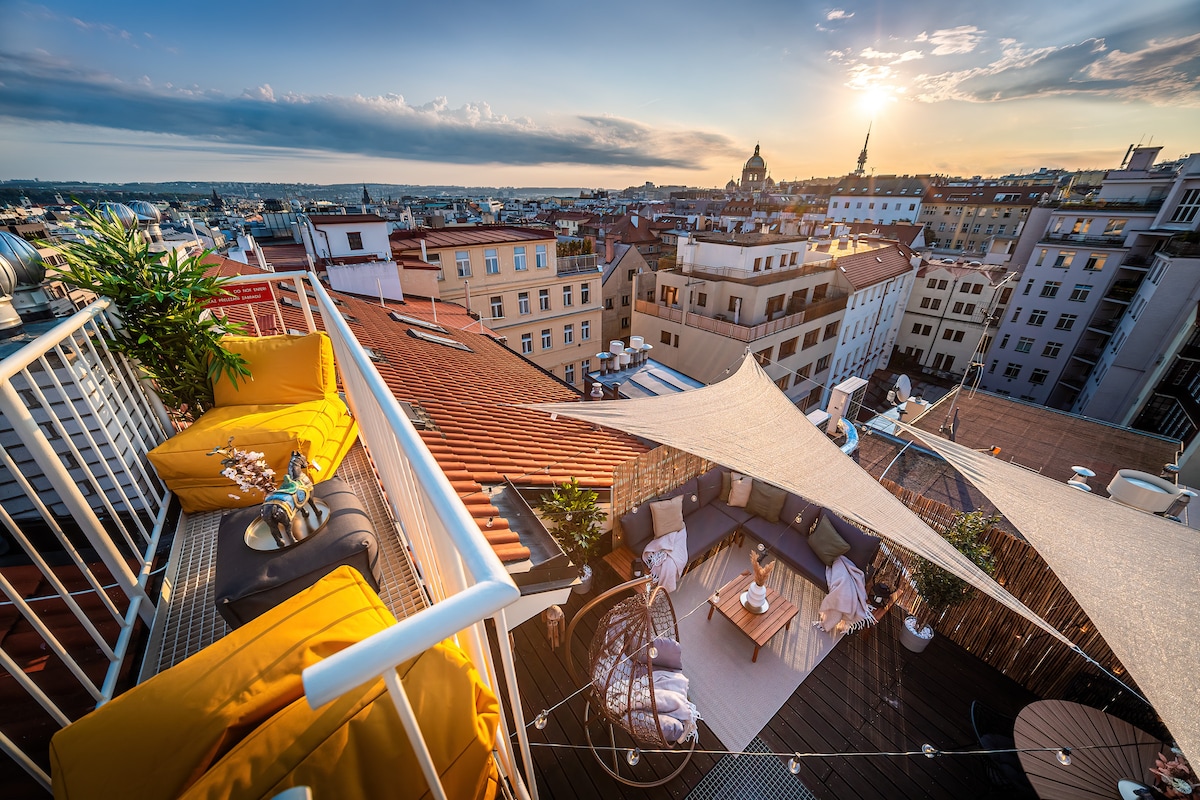 * TOP LOCATION in the center of Prague * PRIVATE TERRACE with amazing view * TWO-STORY SUNNY attic apartment with large windows * NEWLY BUILT and furnished in 2022 * PARKING available by the house * TRAM STOP right at the house * A/C * LIFT Experience unforgettable moments with friends or relax on the private terrace with a panoramic view of historical Prague and the most iconic sights of the Royal City of Prague.. The apartment is surrounded by bars, cafés, restaurants, and grocery stores.