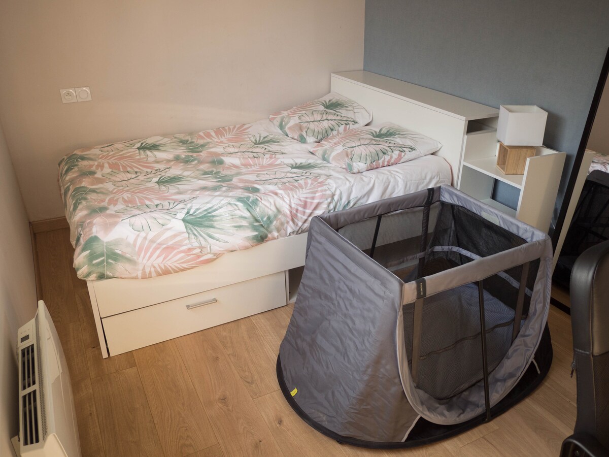 Studio indépendant situé dans notre maison, proche du centre et disponible du dimanche soir au vendredi matin, idéal étudiant en alternance ou travailleur en déplacement. Ce studio de 15m2, entièrement rénové est parfaitement équipé avec lit 140 cm neuf, salle d'eau ouverte (douche et WC), coin cuisine. Vous apprécierez notre logement pour son lit confortable et son indépendance. /!\ Logement STRICTEMENT non-fumeur, pas d'autorisation de fumer devant la maison.