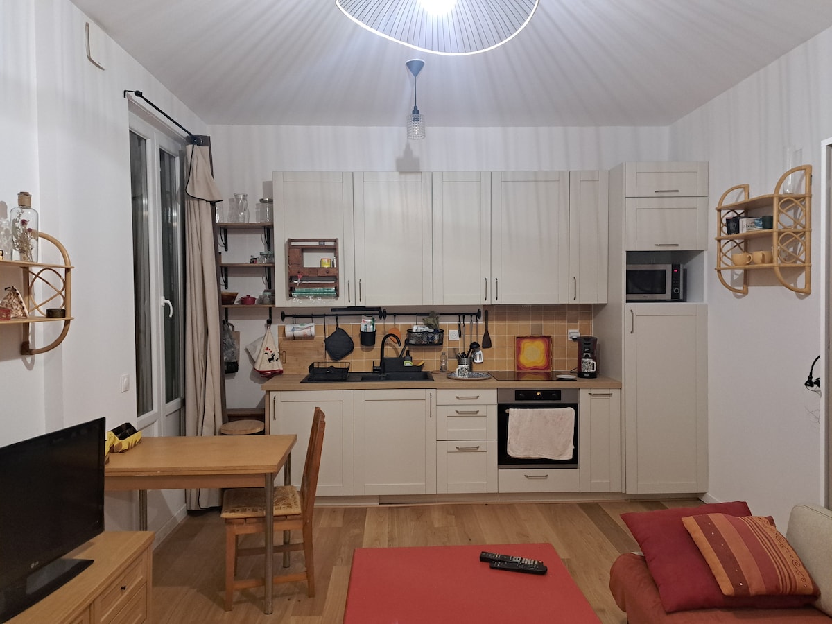 Welcome to our 40m² apartment, a peaceful haven renovated in January 2024, located in the heart of Porte de Paris in Saint-Denis. Just 1 minute walk from metro line 13 and 10 minutes from the Stade de France, my place can accommodate up to 4 guests. Exclusively for you: a fully equipped kitchen, a modern bathroom, and a cozy living space. 🤩 Note: Due to recent water damage, part of the living room ceiling has been affected. Repairs are scheduled. Marc & Estelle