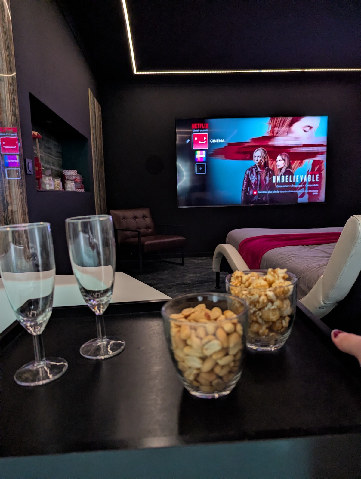 Profitez d'un séjour romantique unique dans une suite de luxe avec écran géant et baignoire balnéo ! Nous vous accueillons dans une maison entièrement rénovée où tout a été pensé pour que vous puissiez profiter d'un moment hors du temps. Pour une nuit magique et romantique avec lit queen size, lumières tamisées, écran XXL, table de billard et bar à bonbons Parfait pour un séjour romantique !
