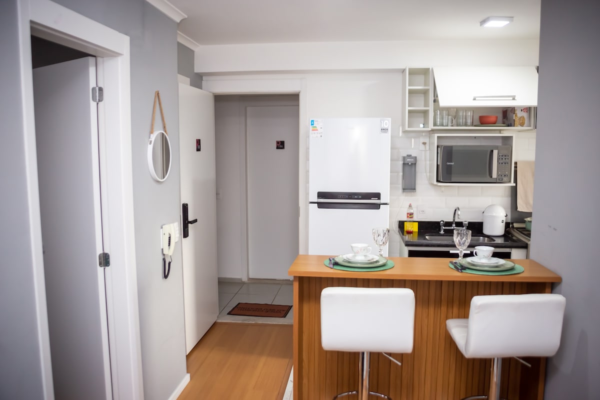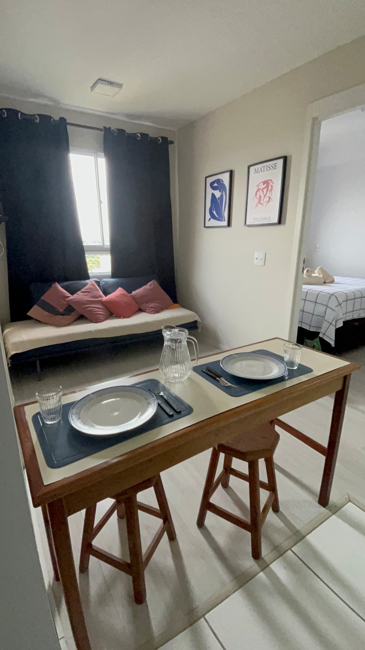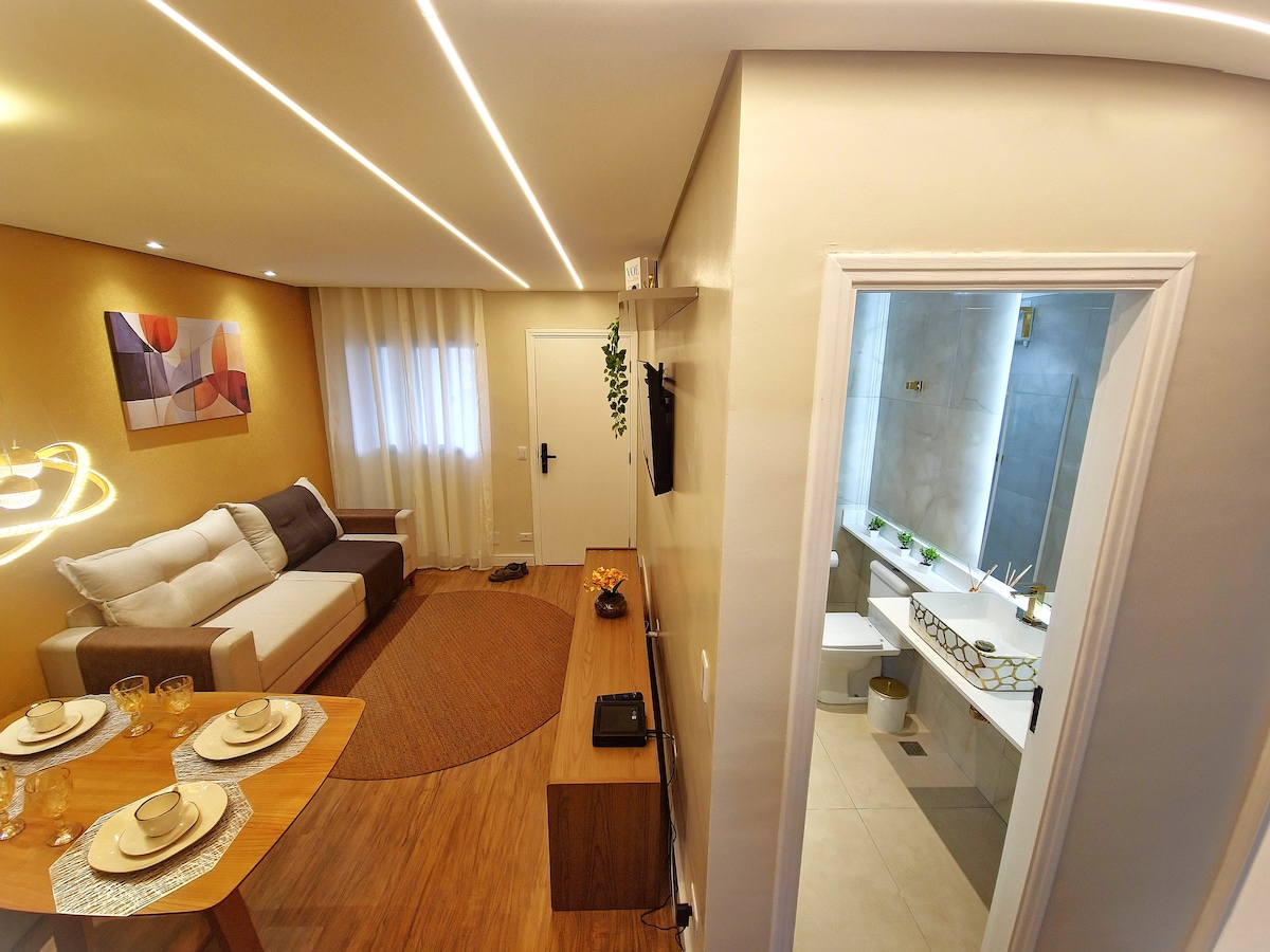 Apartamento novíssimo, no centro de Guarulhos, bem localizado, próximo a mercados, restaurantes, bares, shopping center; Ar-condicionado, máquina lava&seca, forno, fogão, geladeira, utensílios domésticos, home-office, fechadura eletrônica, estacionamento grátis, piscina, sauna, academia entre outros. O apartamento tem tudo o que você precisa para uma ótima estadia para períodos curtos ou longos. O local oferece cama de casal, sofá, televisão com Netflix e PrimeVideo.