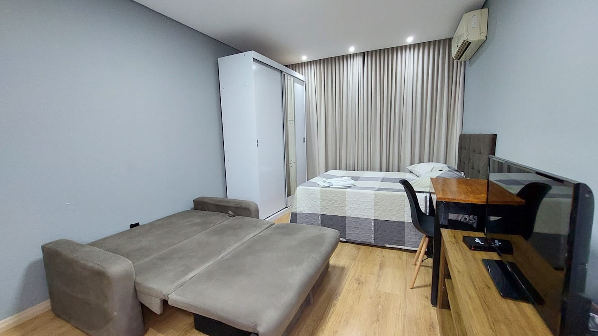 Welcome to your home away from home, strategically located in the center of Criciúma. 950m from Heriberto Hülse Stadium 230m from the Supermarket 200m from the Pharmacy Our 33m² studio is equipped with everything you need for a comfortable and pleasant stay. Ideally located in the heart of Criciúma, just a few minutes' walk from supermarkets, pharmacies, hospitals, shops, restaurants, and the Criciúma Stadium.