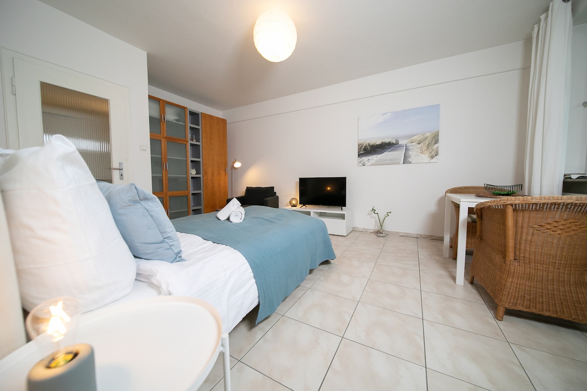 Das Appartement ist zentral in Düsseldorf -Friedrichstadt gelegen. Das Appartement besteht aus einem Ess- und Wohnbereich mit Schlafsofa (mit durchgehender Matratze) sowie einem Schlafzimmer. -Smart-TV und Balkon. Im separaten Schlafzimmer befindet sich ein großes Doppelbett und ein geräumiger Kleiderschrank. Dort ist auch ein heller, großer Schreibtisch vorhanden. Dort kann auch die 3. Person auf dem Extrabett schlafen. Die Betten sind bereits bezogen und Handtücher liegen bereit.