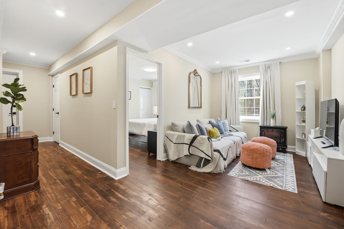 Immaculate cozy basement suite in a quiet single-family home, 30 miles from DC, 2 miles from I-95, 7.5 to Quantico, 18 to Fort Belvoir, near Potomac Mills. Enjoy 2 spacious bedrooms, a warm living area w/ fireplace, and stylish décor that makes you feel right at home. Perfect for relaxing after a day of exploring. Includes private entrance and kitchenette. Due to severe allergies, no seafood cooking allowed and no pets. Ideal for guests seeking comfort, convenience, and a truly pristine space.