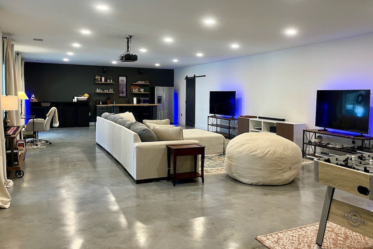 Bring your furry friends to this spacious, pet-friendly retreat! Enjoy a modern entertainment area, dedicated workspaces, and cozy bedding—including a hidden Murphy bed. Step outside to a large patio with outdoor dining and a fire pit, perfect for relaxing evenings. Settle in, stretch out, and enjoy the kind of comfort that makes you—and your pets—feel right at home. *Similar listings provide flexibility in sleeping arrangements. All amenities are included.*