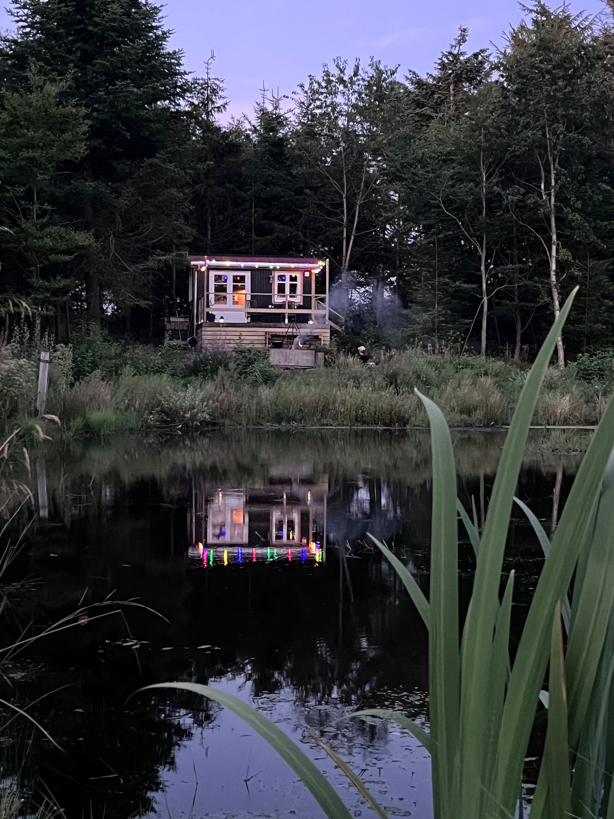Et lille eventyr i skoven – skurvognen Skovly med udsigt og bålhygge Gemt i en lysning venter en skurvogn med sjæl. Vågn op til fuglesang og duften af skov, mens morgensolen rammer engen og åen glitrer i det fjerne. Inde finder du dobbeltseng, spiseplads og et lille tekøkken med alt det nødvendige. Udenfor venter en træterrasse og en stor bålplads med udekøkken – perfekt til madlavning under stjernerne. Her er kun naturens lyde og roen, du har længtes efter.