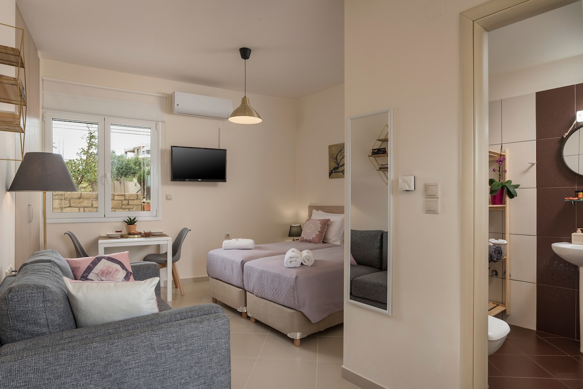 The DS Seaside Studio is located in a graphic area and is just a 10 minutes walk from the beaches "Chrissi Akti", "Aptera" and "Agioi Apostoloi". The city is located 2.8 km away. Ideal for 2 people with a comfortable king size bed (160cm x 200 cm). Spacious garden with view. Free parking space is available.