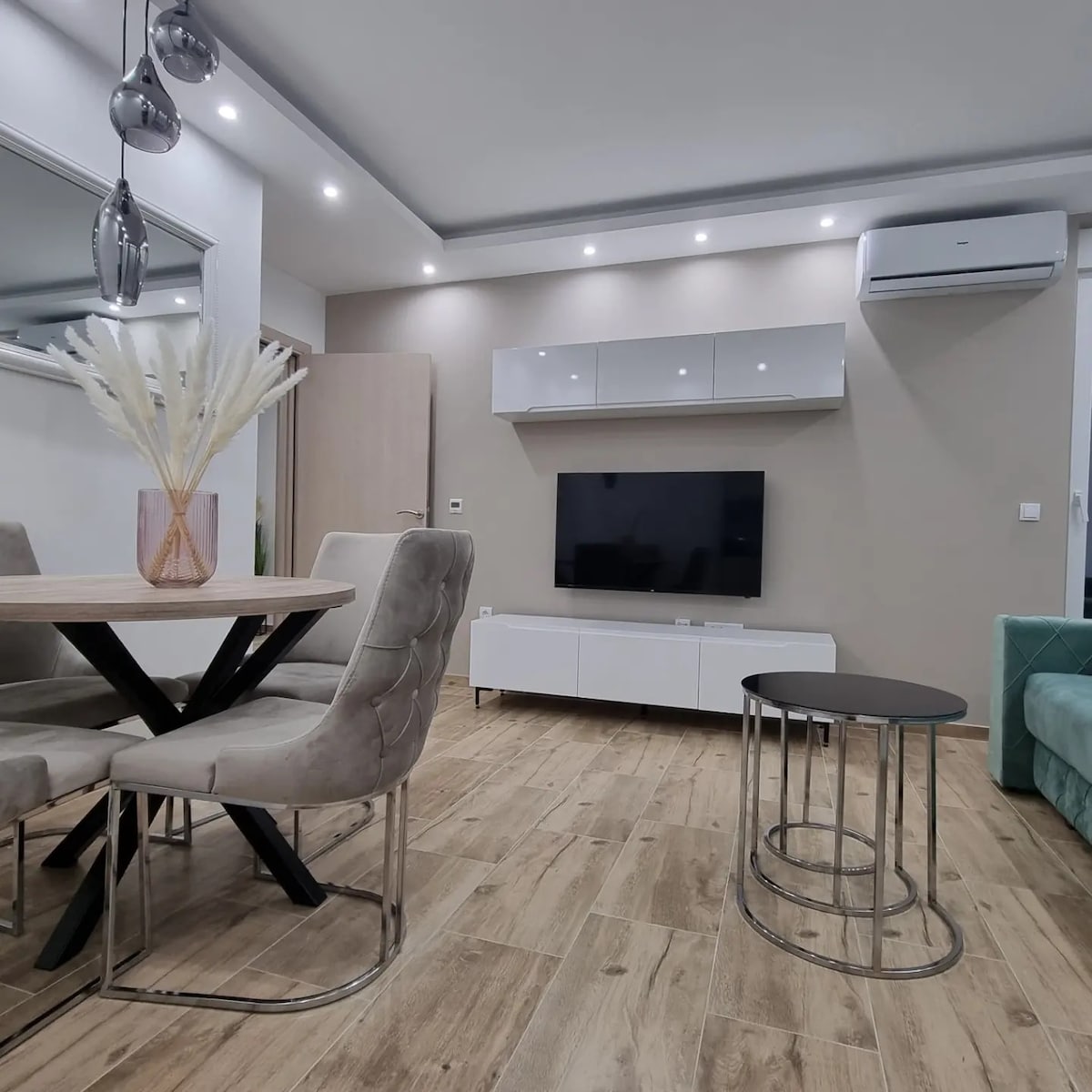 The apartment is located in the very center of the city, as soon as you step out of the building you are at the main square of Šabac. The size of the apartment is 55m^2, the layout of the rooms is kitchen with dining room, bathroom, living room and bedroom. The apartment was completely renovated in 2025, it was moved in with completely new furniture. There is a cafe just 20 m away, a restaurant 50 m away, and a market 150 m away.