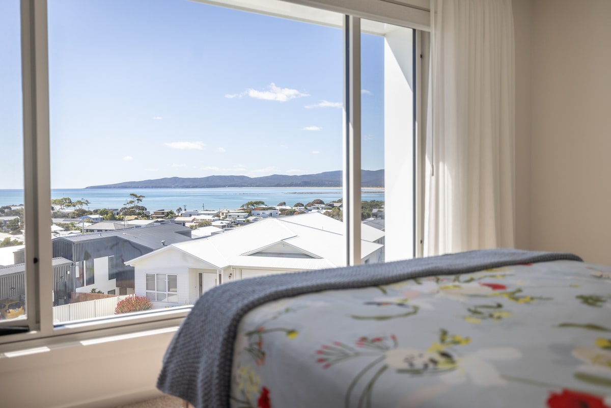 Wake to sunrise over Bass Strait and watch Stanley's iconic Nut glow orange in the evening light—all from your freestanding spa bath. Perched on the hillside above Stanley, Horizon offers the kind of sweeping coastal views that make you want to stay in your apartment all day. Floor-to-ceiling windows frame the entire spectacle: The Nut, Godfrey's Beach, Rocky Cape National Park, and the fishing boats heading out at dawn.