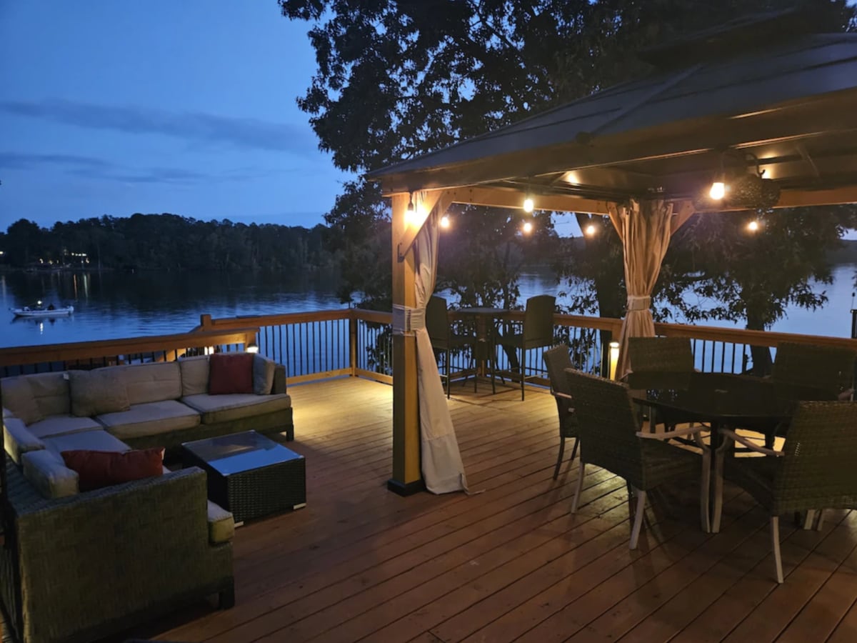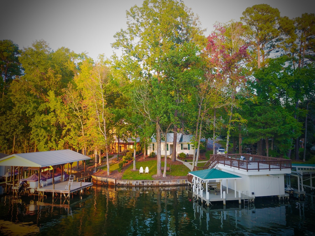 Relax, recharge, and enjoy “Ahhmeetun” on beautiful Lake Tillery, NC. It is the perfect place to boat, kayak, swim, fish, relax, celebrate, reunite, or just soak in the million-dollar wide-water view of the Morrow and Uharrie Mountains. This family friendly, expansive, and rustic home has 2 master suites, 2 queen cabins, and a built-in bunk room. Bring your friends, family, business partners on down because it is time for “Ahhmeetun.”
