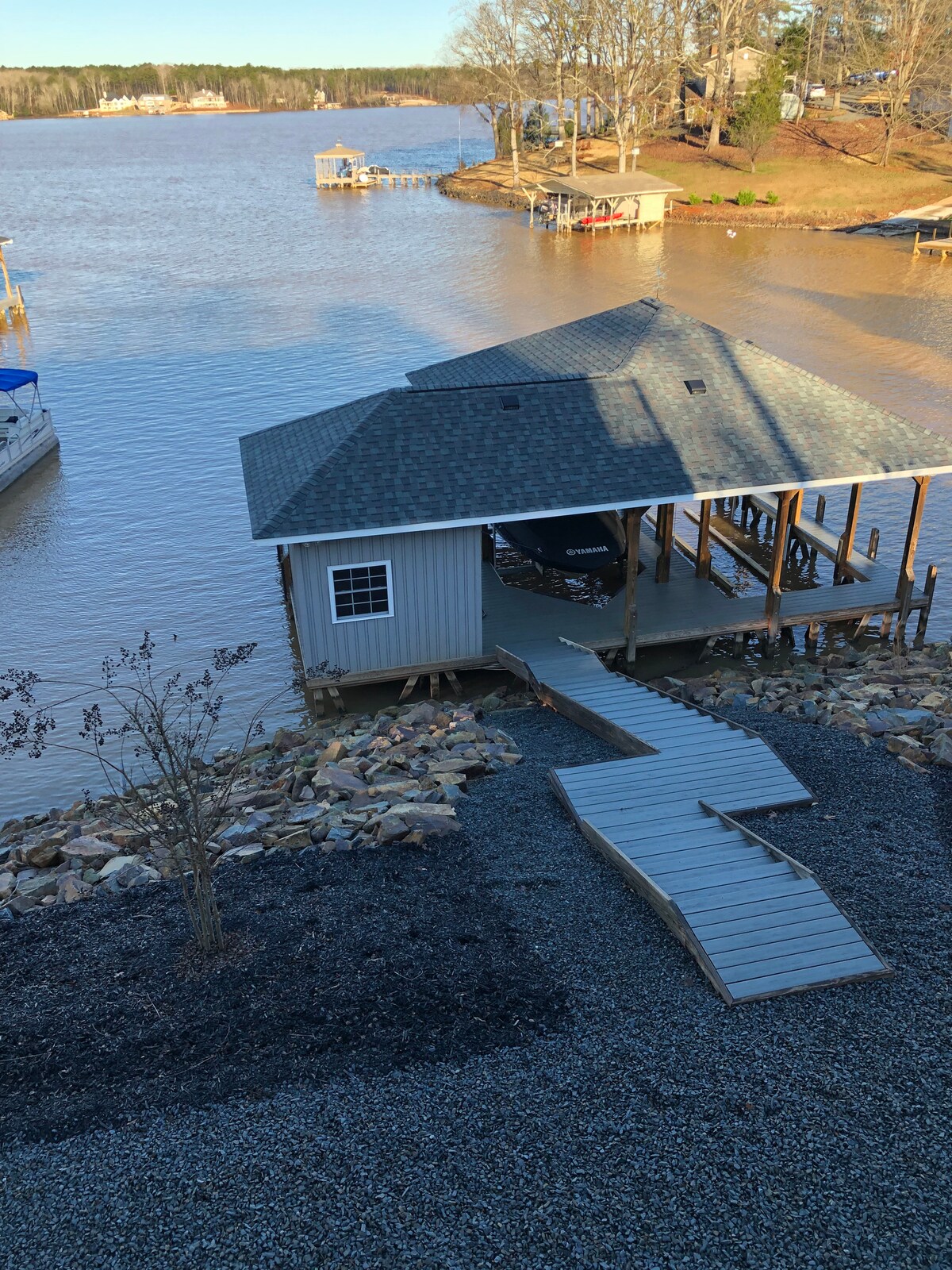 Welcome to Dock Holiday! Let lake life take away all your cares and relax. Beautiful views of the lake from the deck, the gazebo or the dock and a great cove for kayaking or floating around the dock. Downstairs includes 1 King bedroom and a 2 Twin XL bedroom that share a large bathroom. Upstairs is the Master with a King bed and bathroom. Large flat yard for games or grilling. Float pad, floats, life vests and kayaks included.