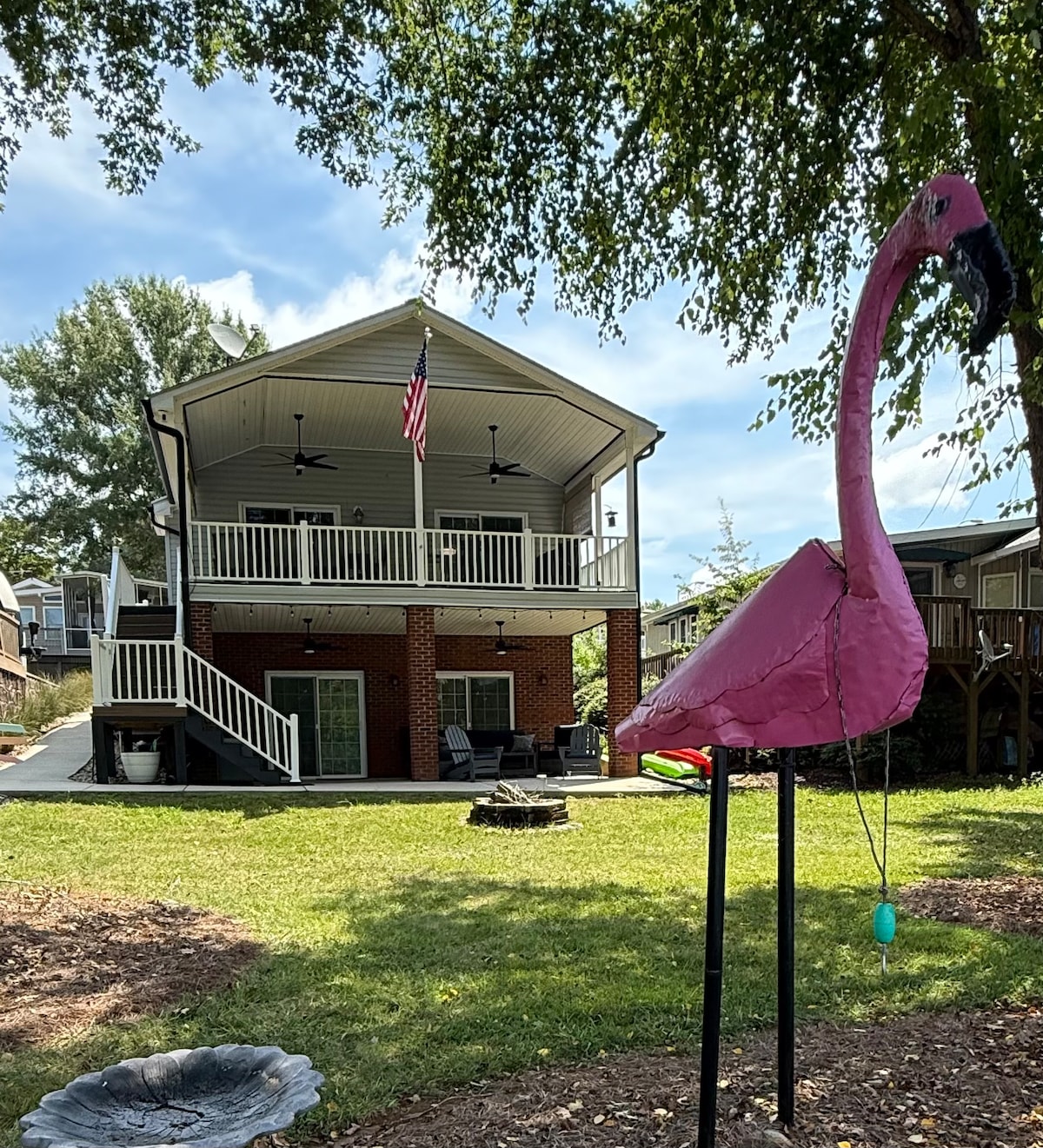 Welcome! Relax and unwind at our lakefront getaway. Bring your boat, jet skis, fishing poles, and golf clubs—there’s fun for everyone here! Start your mornings with a cup of coffee on the dock as you gaze across the lake toward the peaceful Goat Island. Watch fish jump and enjoy the sights and sounds of local wildlife all around you. Spend the day swimming or cruising the lake, then cast a line off the dock under the stars. After a full day of adventure, you’ll drift off easily in our cozy beds.