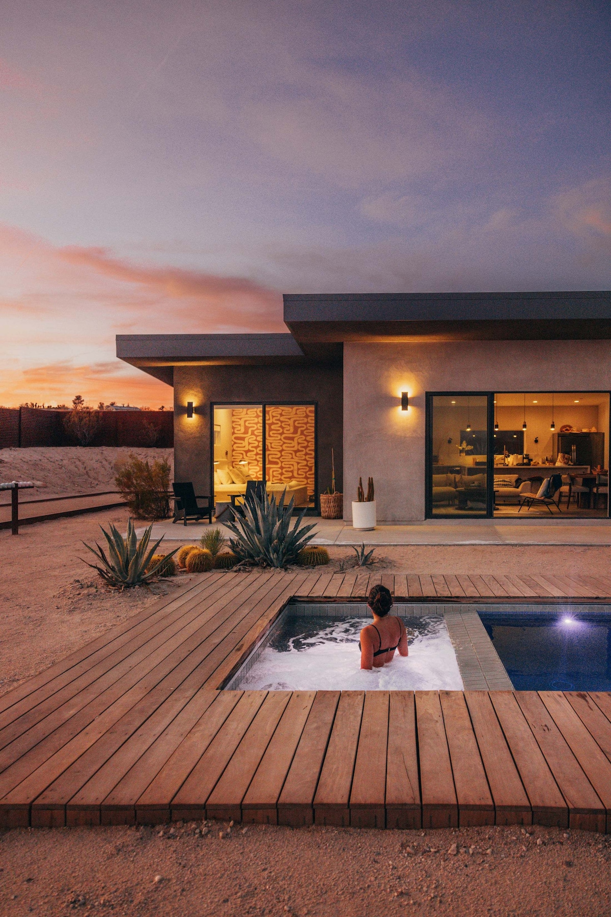 Created as a sacred space to connect with the desert’s beauty, Skyfall is a soulful yet elegant home that merges an organic modern aesthetic with the natural surroundings. Resting on 2.5 acres of majestic land just outside Joshua Tree National Park, this property is home to ancient boulders, native plants, and abundant wildlife. While here, we invite you to soak in the saltwater pool and spa, gaze at the Milky Way under the night sky, or capture the radiance of the sun setting over the horizon.