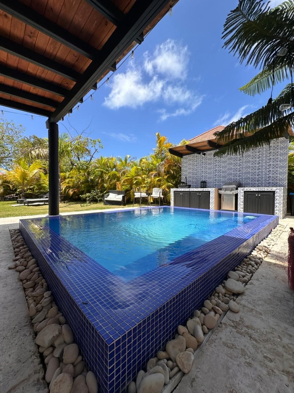 Luxurious Villa built in 2021 specifically for intimate groups. The villa features 6 bedrooms with AC's, private bathrooms and direct access to the pool. Villa has 2 kitchens (inside and outside), BBQ, full size bar, disco with DJ booth, artificial beach, foam machine for the HEATED pool, two Jacuzzi's (one private), game room, a movie theater and wifi throughout the entire property. The villa also comes with a full time staff of two to assist you at any time