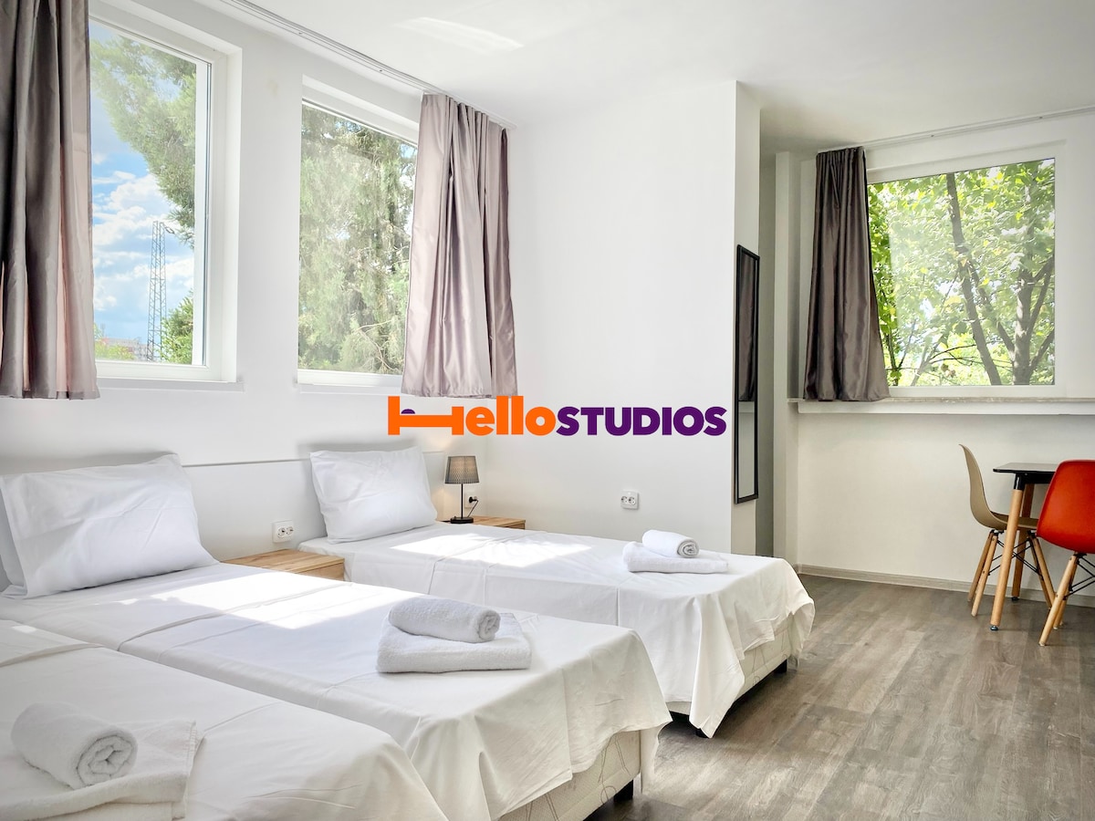 Hello Studios Budget Stays for 2 guests предлага разнообразие от възможности за настаняване за краткосрочен, средносрочен или дългосрочен престой: 14 студиа, 9 хотелски стаи и 1 апартамент с тераса, подходящи за 2, 3 или 4 гости. Отлична локация с безплатен паркинг, удобна както за туристи, така и за работещи. Намира се на 5 минути пеша от централните ЖП и Автогара, и на 15 минути от центъра на града.