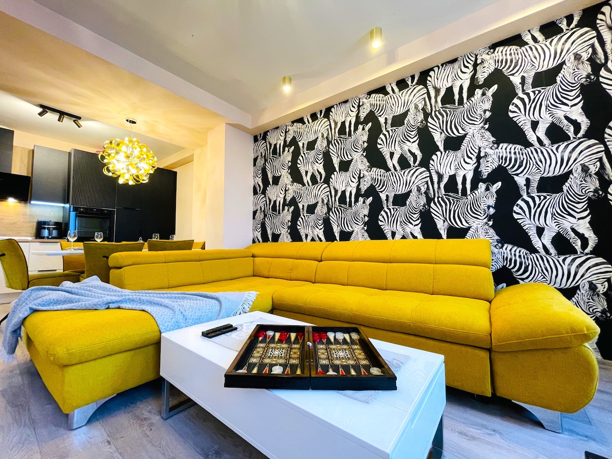 Добре дошли във Вашето чисто ново, луксозно място в Сърцето на Стара Загора. Разположен на чудесна локация, в централната част на града, на тиха улица в чисто нова бутикова сграда. Обзаведен с много заряд за положителни емоции, в еклектичен стил от минимализъм и лукс, вярваме, че ще покрие критериите Ви за търсен престой в града на Липите. Апартамента разполага със собствено паркомясто, точно под терасата на апартамента, което е безплатно за гостите. NETFLIX, HBO and Cinemax, Diema EXtra